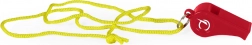 Rdeča plastična piščalka pritrjena na rumeni vrvici, idealna za signalizacijo ali športne aktivnosti.