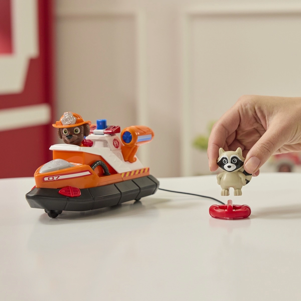 Zuma, visok več kot 5 cm v svojem gasilskem uniformu, je pripravljen rešiti situacijo. Požarna ladja je opremljena z reševalnim obročem, pritrjenim na vrvico, kar zagotavlja veliko akcijskih dogodivščin. Zumi doda šarm tudi mali rakun, ki ga je mogoče rešiti. Otroci lahko pritisnejo gumb za izstrelitev reševalnega obroča, v katerega se rakun popolnoma prilega. Zahvaljujoč originalnemu slogu Tačk na patrulji ta igrača izgleda natanko tako kot v seriji in navdihuje otroke k doživljanju dogodivščin.