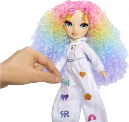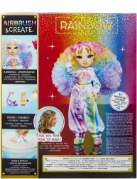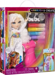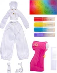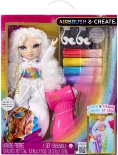 Ta ustvarjalna punčka je kot prazno platno – povsem v belem, z belimi lasmi in opravom, pripravljenim na vašo domišljijo. V paketu najdete štiri izpravljive mavrične flomastre (rdeča, rumena, modra, vijoličasta) in priročen airbrush za lahko senčenje in enakomerno nanašanje barve.