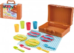 Ta otroški pikniški set s košaro ponudi malim kuharjem vse, kar potrebujejo za popoln piknik. V trpežni plastični košari najdete krožnike, lončke in komplete pribora za štiri osebe ter dodatno modno odejo s karo vzorcem. Set je iz lahke, enostavno pralne plastike, zato je idealen za vsakodnevno igro.