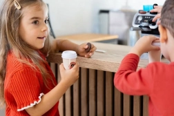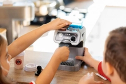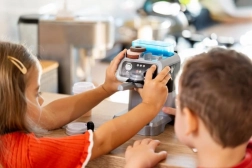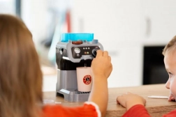 Ta sodoben in otrokom prijazen kavovar spremeni otroško kuhinjo v malo kavarno. Dovolj je napolniti rezervoar z vodo, vstaviti kapsulo, jo rahlo stisniti s tamperjem in pritisniti gumb – voda bo stekla v lonček kot pravo espresso. Idealno za ustvarjalno igro s prijatelji, sorojenci in pliškoti.