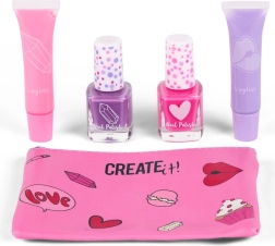 • Celovit set za prve korake v ličenju: 2× glos za ustnice, 2× lak za nohte, kozmetična torbica.
