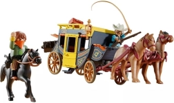 Postanite kočijaž poštne diligence in zaščitite dragocen tovor pred zamaskiranim razbojnikom. Ta podroben komplet PLAYMOBIL prinaša akcijo, napetost in humor – od plakata »Išče se« do lisic in orožja za filmske prizore z Divjega zahoda. Odstranljiva streha razkrije bogato opremljeno notranjost, medtem ko trije konji zagotavljajo hiter beg čez prerijo.