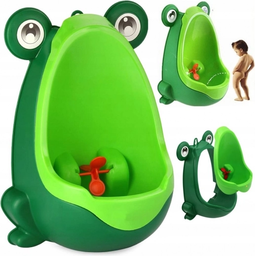 Otroški pisoar FreeON Žabica zelen s priseski, nastavljivo višino in vrtečo tarčo. Enostavno čiščenje, trpežna plastika, idealno za navajanje dečkov.