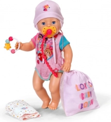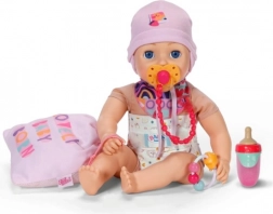 Popoln komplet dodatkov za nego punčke BABY BORN velikosti 43 cm. Vsebuje stekleničko, kapico, pleničko, slinček, ropotuljico, dudo in verižico za dudo – vse v modernih barvah za slogovno igranje. Čarobna duda pri izbranih punčkah pomaga zapirati oči in jo je možno dodatno okrasiti s pripenjalnimi okraski (niso priloženi). Idealno za igranje vlog nege in razvoj fine motorike.