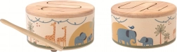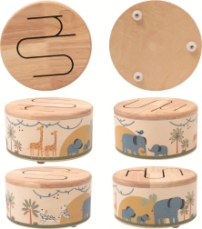 Odkrijte veselje prvih ritmov z otroškim lesenim bobnom z motivi safarija. Ta varen in trpežen boben iz naravnega lesa z ljubkimi ilustracijami slonov, žiraf in zeber je priložen s paličico in odlično sede v majhne ročice. Spodbuja fino motoriko, ritmični občutek in glasbeno zaznavanje – idealna izbira za prve glasbene raziskave.