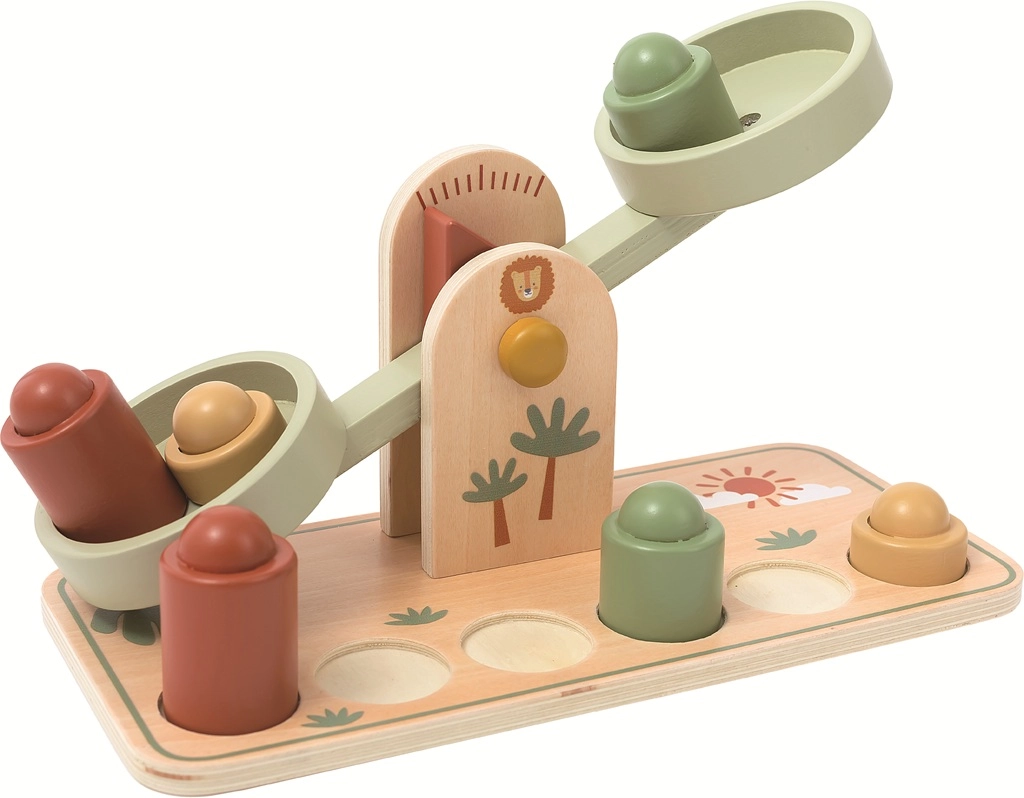 Lesena otroška tehtnica ponuja zabavno in intuitivno spoznavanje principov uravnoteženja. Dve posodici in osrednji kazalnik otrokom jasno pokažeta, kaj je težje in kaj lažje. Set vsebuje 6 barvnih uteži v treh različnih težah (po dva kosa), zato je enostavno preizkušati različne kombinacije in eksperimente.