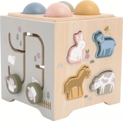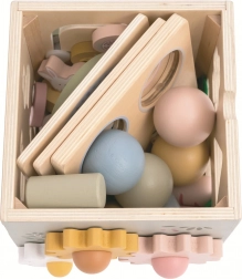 Ta kakovostna lesena motorična kocka v nežnih pastelnih barvah in s simpatičnimi ilustracijami živali spodbuja naravno radovednost otrok. S 5 igralnimi stranmi in zamenljivimi pokrovi ponuja veliko načinov za učenje in zabavo – od razvrščanja oblik in živalic, preko zlaganja in obračanja, do prvih korakov v štetju. Po igri preprosto pospravite vse dele v notranjost, tako da ostane doma red.