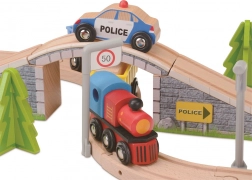 Ta natančno zasnovana vlakovna proga ponuja popoln svet na tirih: lokomotivo z vagoni, avtomobile, figurice, policijsko postajo, heliport, drevesa in prometno signalizacijo. Otroci lahko naložijo tovor, se zapeljejo čez dvignjen most, ustavijo pri postaji in varno prečkajo železniški prehod z zapornicami. Vsaka vožnja se spremeni v novo zgodbo ter razvija logiko, koordinacijo oko–roka in komunikacijo pri skupni igri.