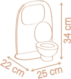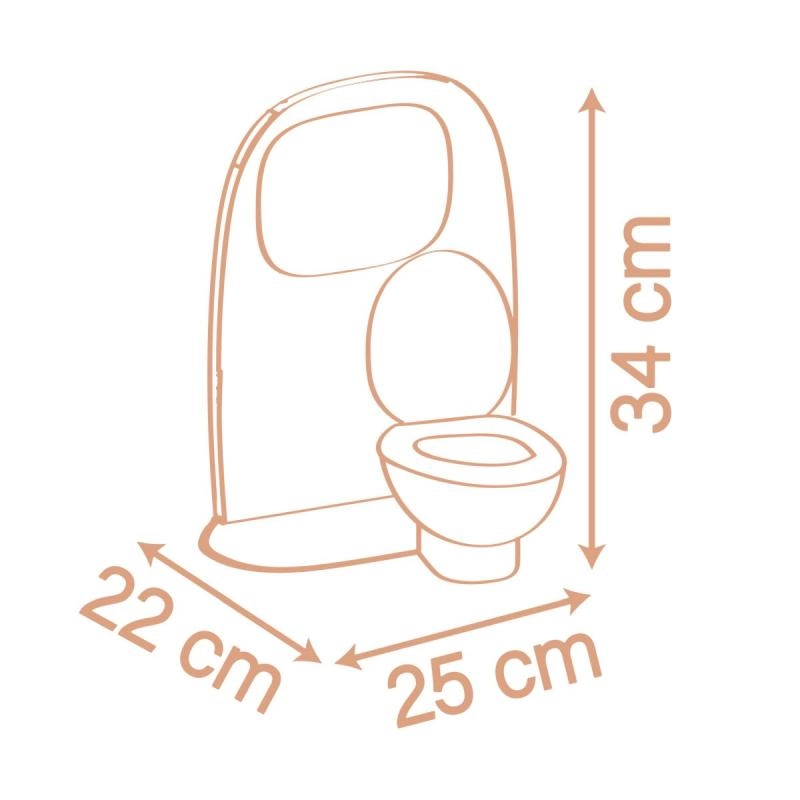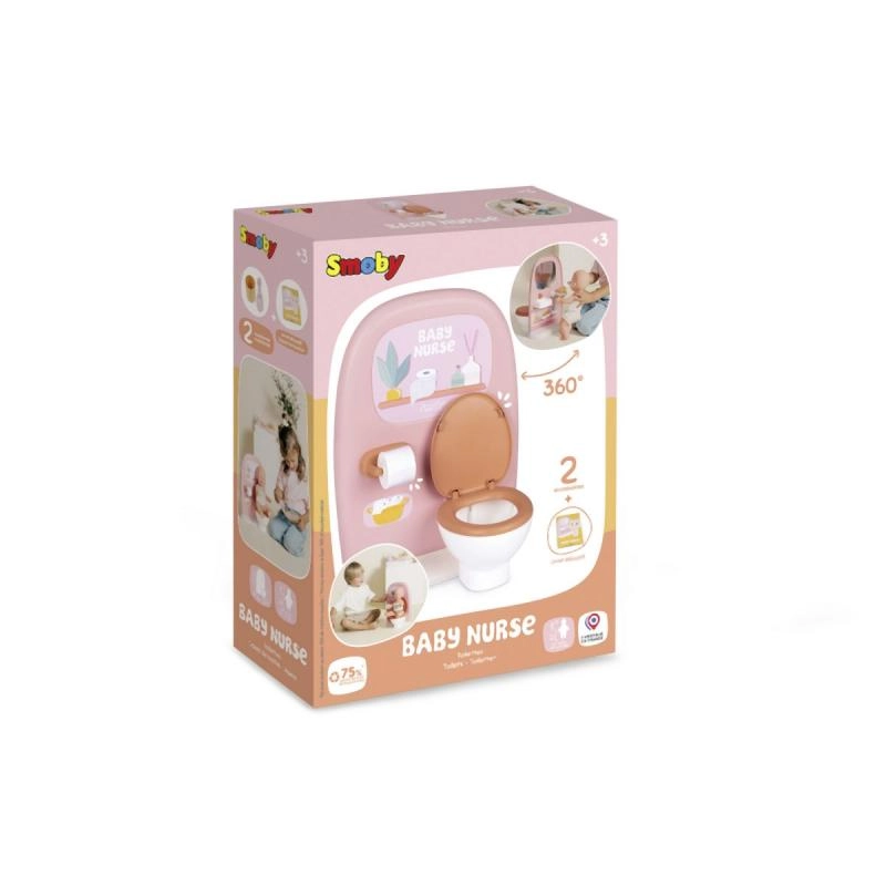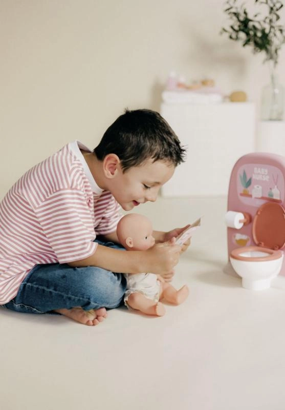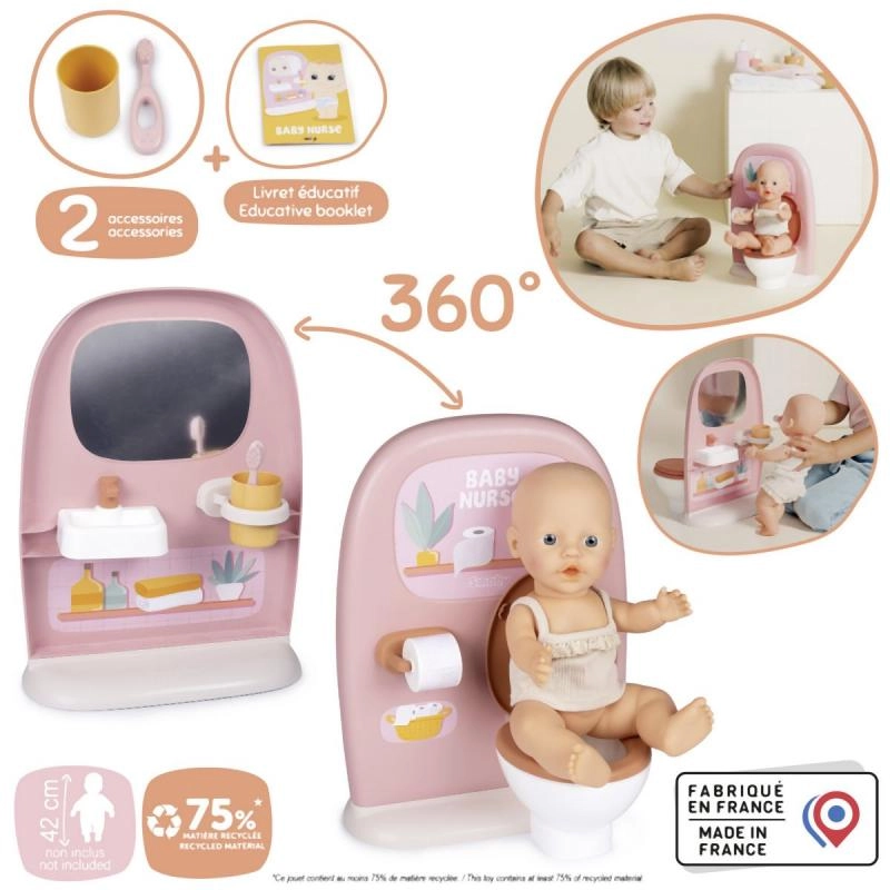 Stilski kopalni komplet za punčke iz linije Baby Nurse prinaša vse potrebno za vsakodnevno nego. V kompletu so stranišče, umivalnik z ogledalom, rolica toaletnega papirja ter dodatki, kot sta zobna ščetka in lonček. Primerno za punčke do 42 cm in izdelano iz najmanj 75 % recikliranega materiala.