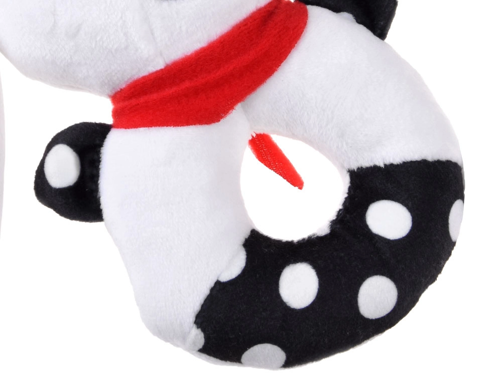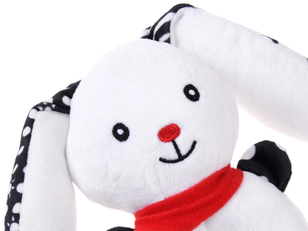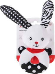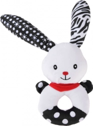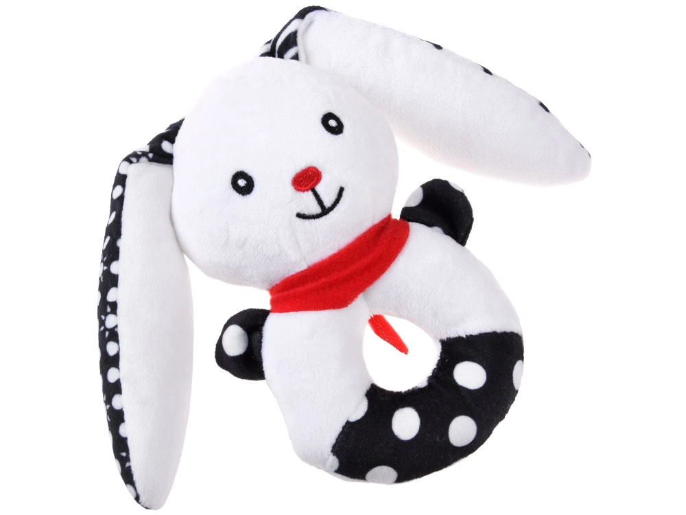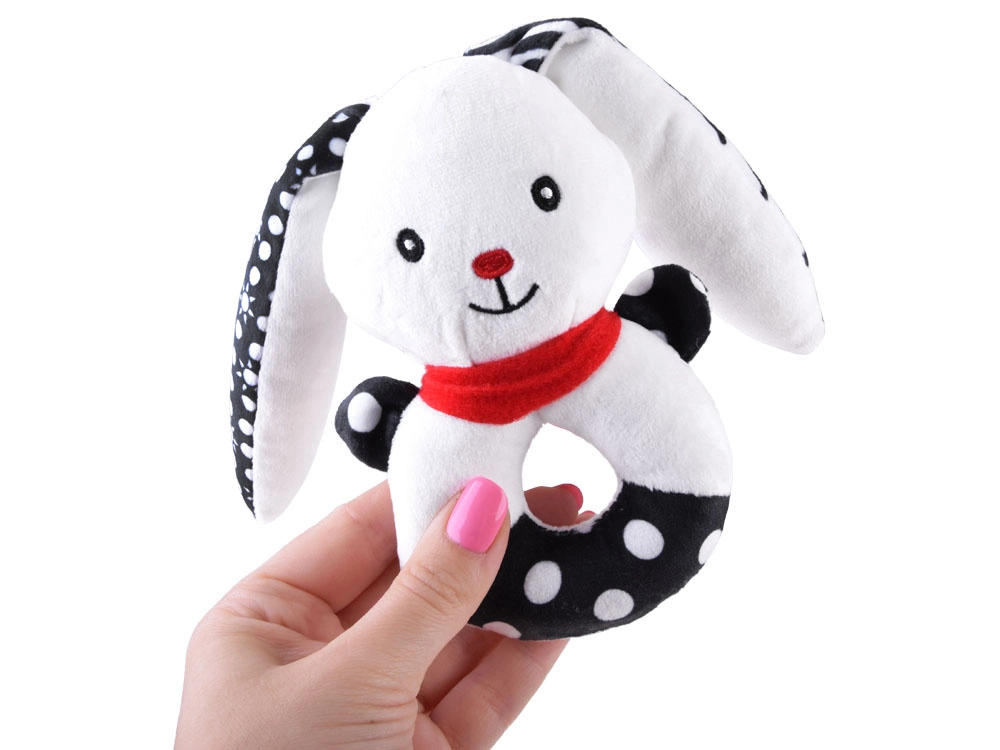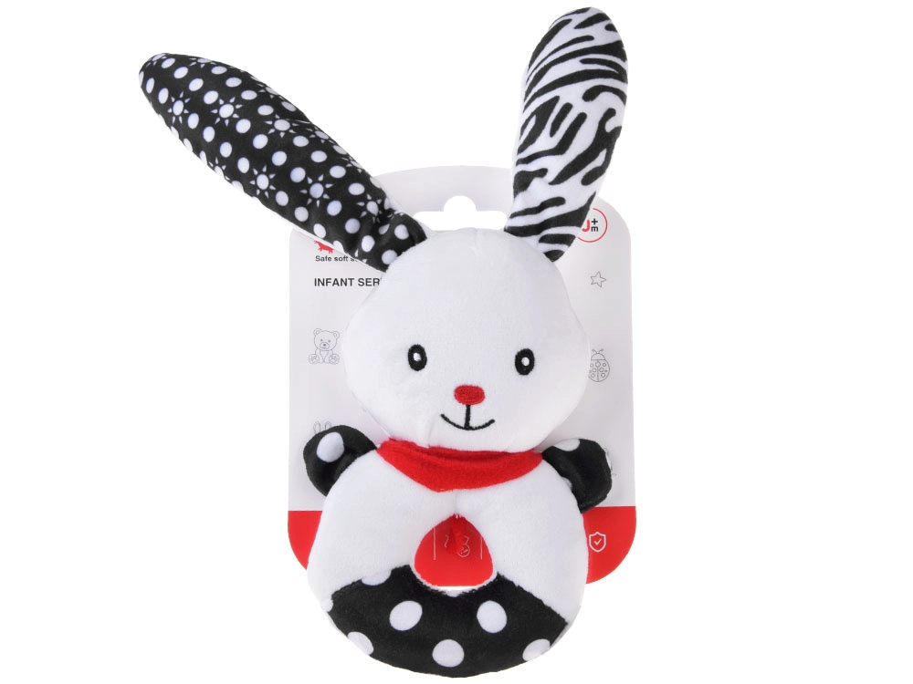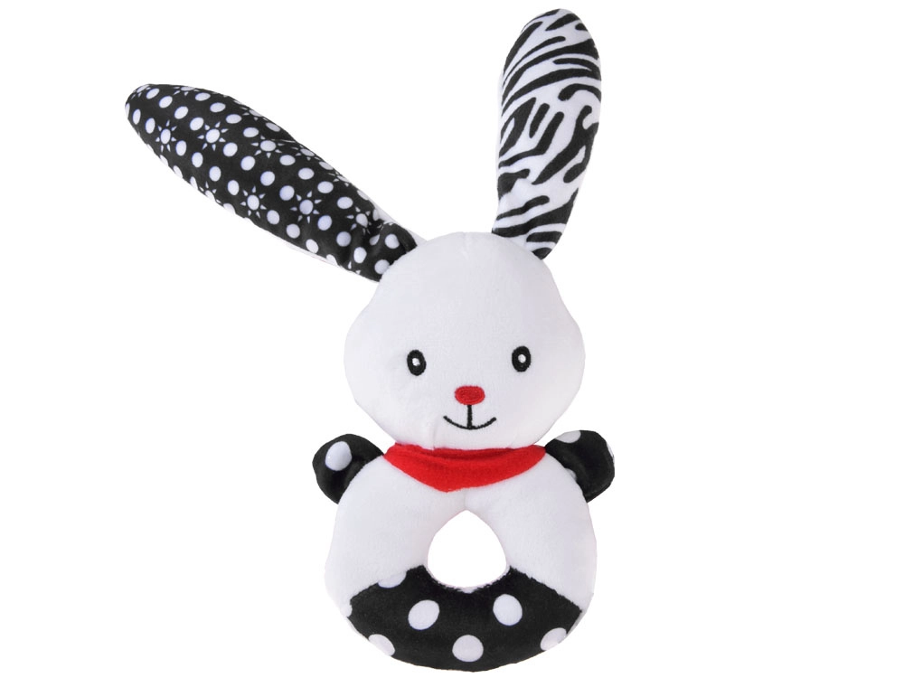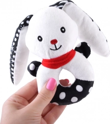 Ta mehka kontrastna igrača združuje funkcijo ropotuljice, piskalca in prve ljubkovalne igrače. Okrogla, enostavno oprijemljiva oblika z odprtino na sredini, izbočeno glavico in dolgimi ušeski pomaga uriti fino motoriko in koordinacijo roka–oko. Kontrastni črno-beli motivi so za dojenčke odlično vidni in pritegnejo njihovo pozornost.