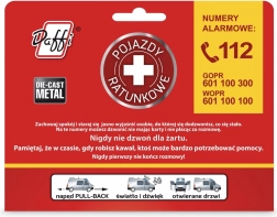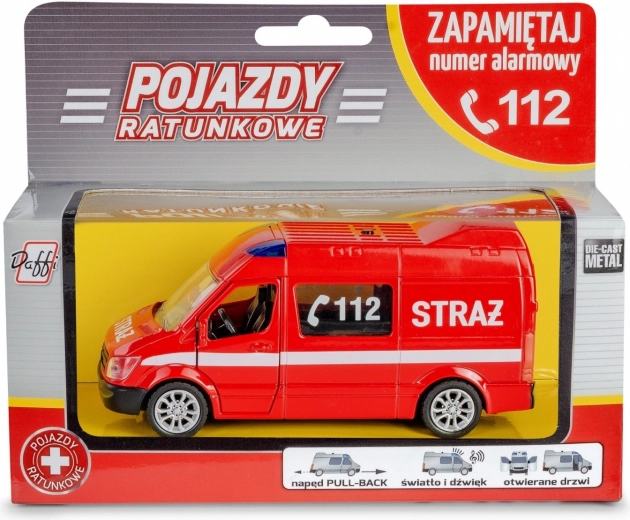 Realističen kovinski model reševalnega vozila tipa kombi iz serije gasilci, reševalna služba in policija. Ponuja pogon na poteg-nazaj, odpirajoča se vrata ter svetlobne in zvočne učinke, zaradi katerih je igra še zabavnejša in poučnejša. Na embalaži najdete nujno številko in osnovna pravila vedenja v kriznih situacijah.