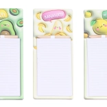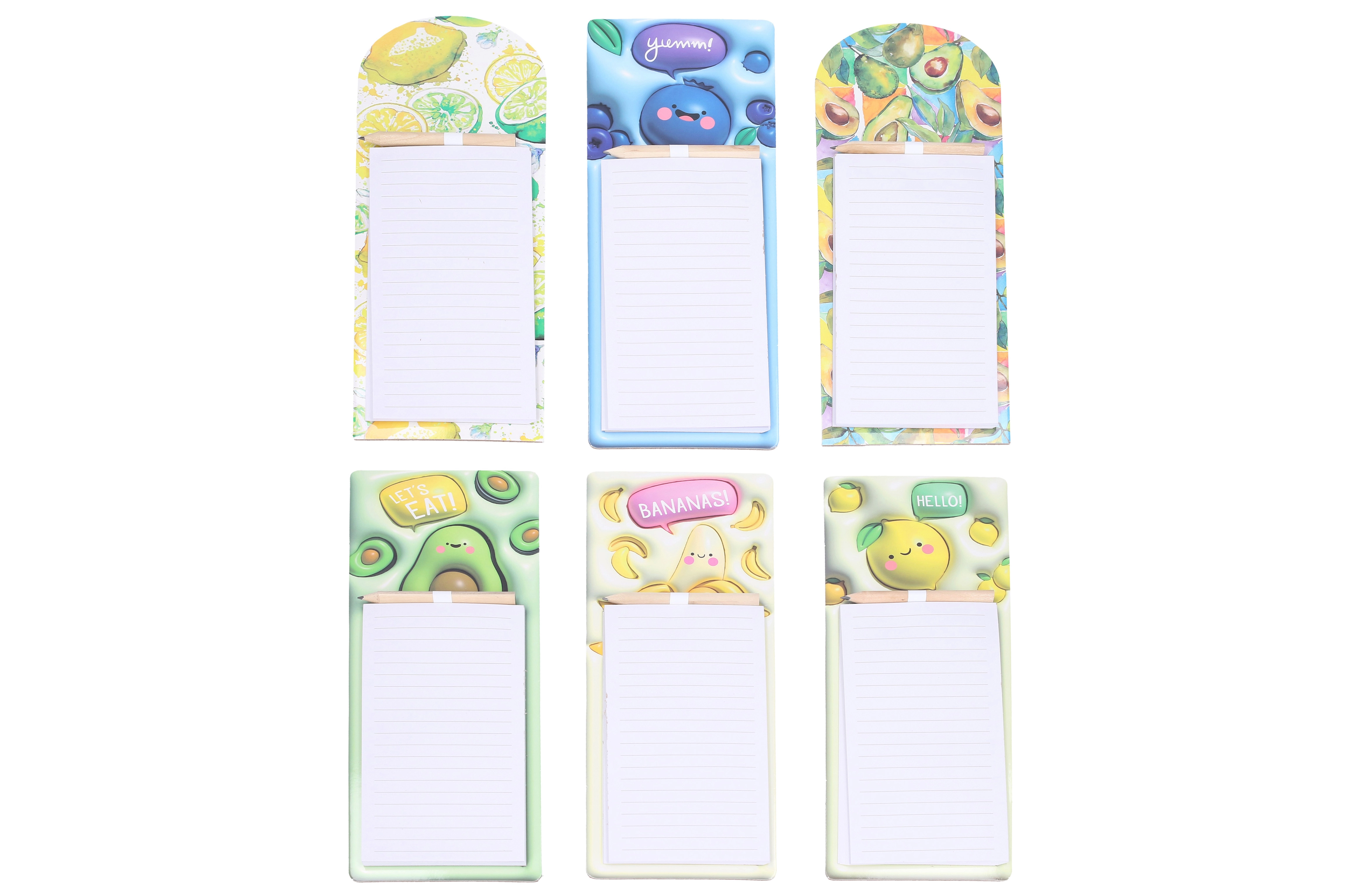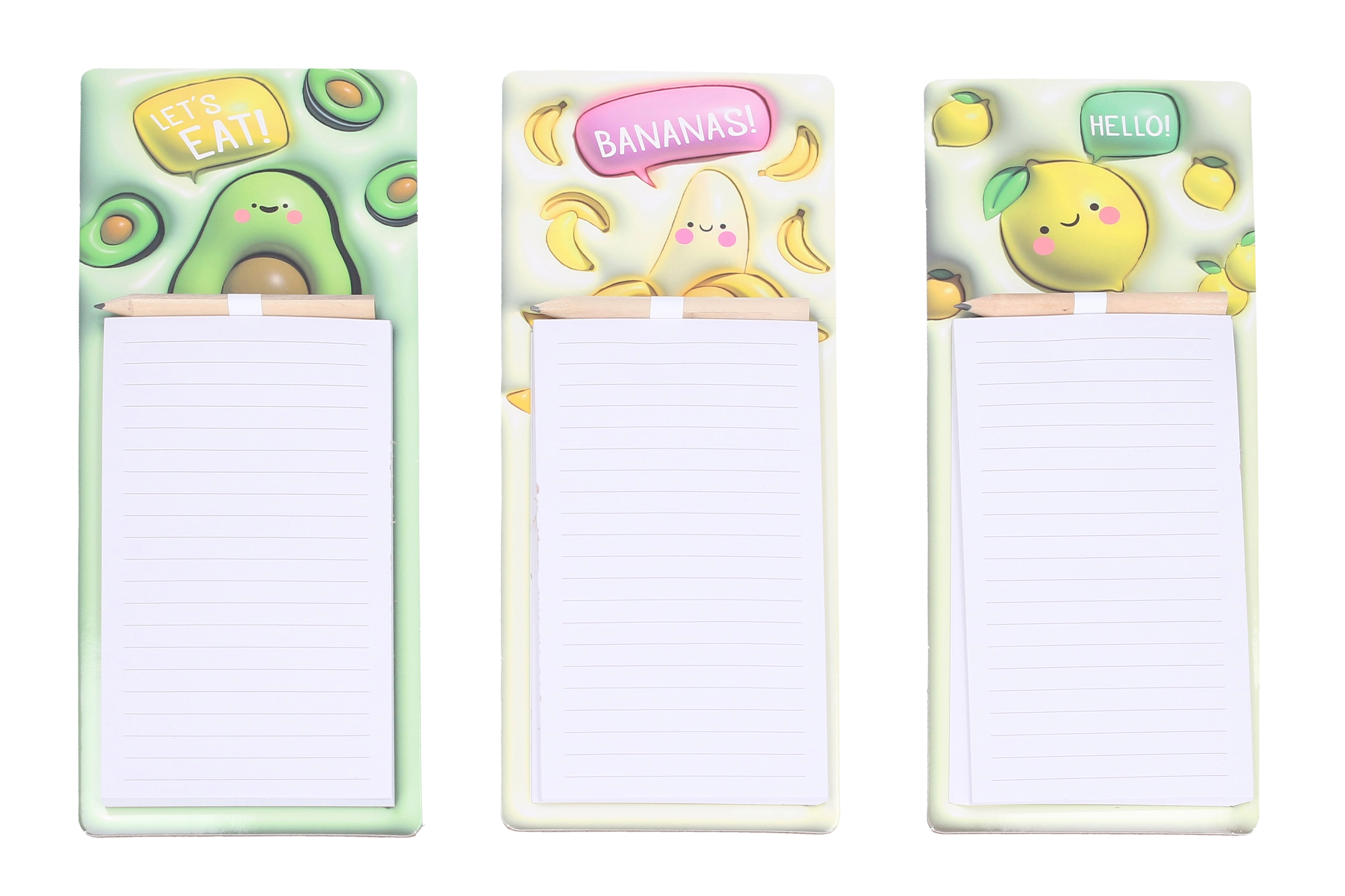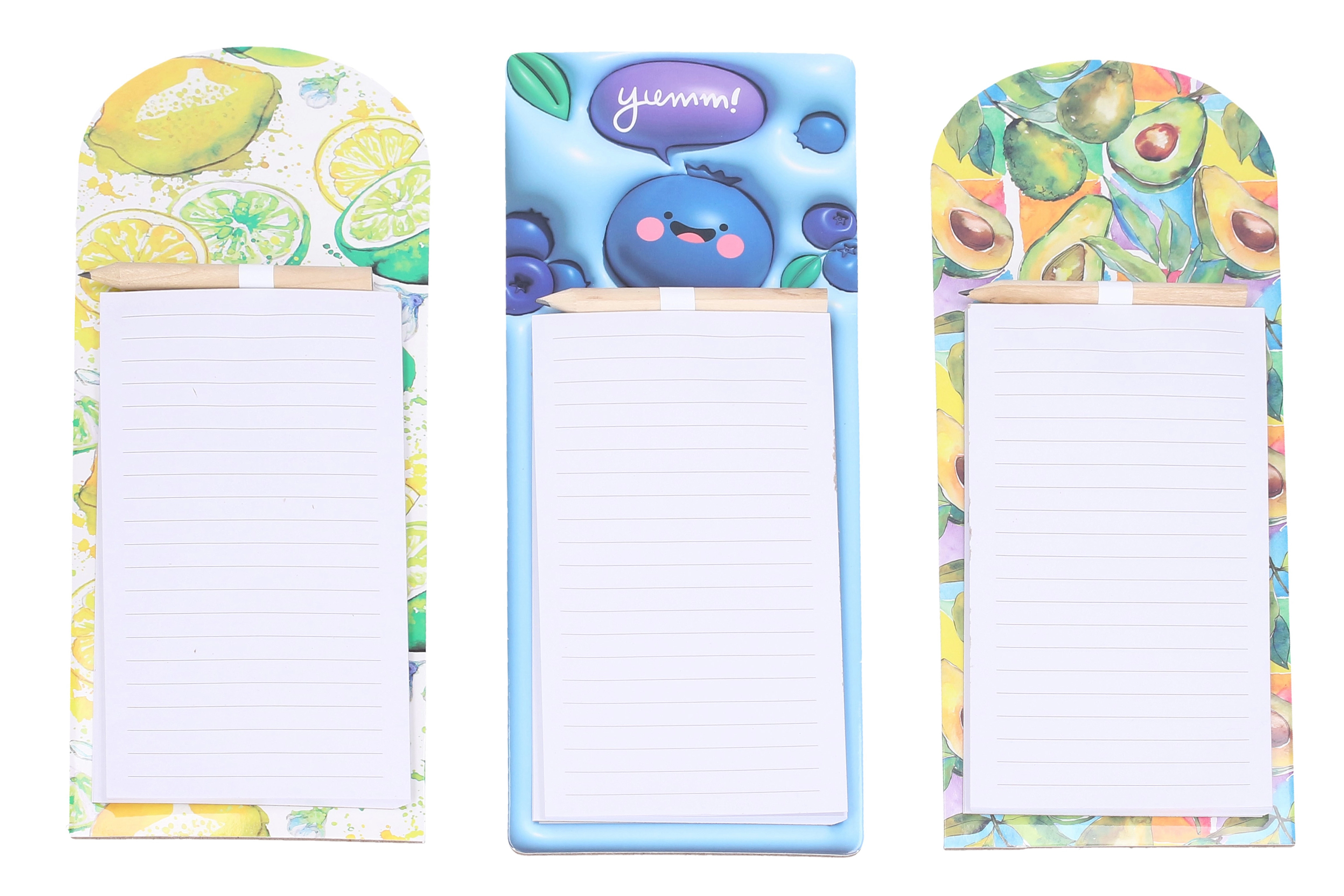 Ohranite red pri nakupih in vsakodnevnih opravilih z magnetnimi beležnicami z veselimi sadnimi motivi. Zahvaljujoč močnemu magnetu jih zlahka pritrdite na hladilnik ali druge kovinske površine, zato bodo vedno pri roki. Priložen je praktičen svinčnik, pripet v zgornjem delu, da lahko pišete kadarkoli in brez iskanja.