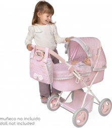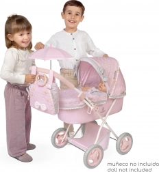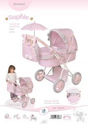 Odkrijte romantičen voziček za punčke iz kolekcije SOPHIE z nežnimi čipkami in pentljami. Svetlo rožnata barva v kombinaciji z sivimi in belimi detajli deluje čarobno ter poudarja španski dizajn in natančno izdelavo. Zložljiv mehanizem omogoča udobno shranjevanje in prenašanje, zato je voziček pripravljen za igro doma in na prostem.