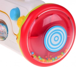 Raznoliki upravljalni elementi, kroglice in ropotuljica urijo fino motoriko, podpirajo zbranost in prinašajo zabavne zvočne učinke.