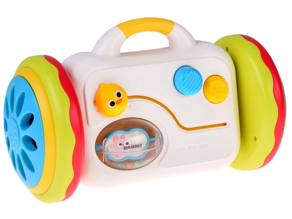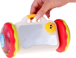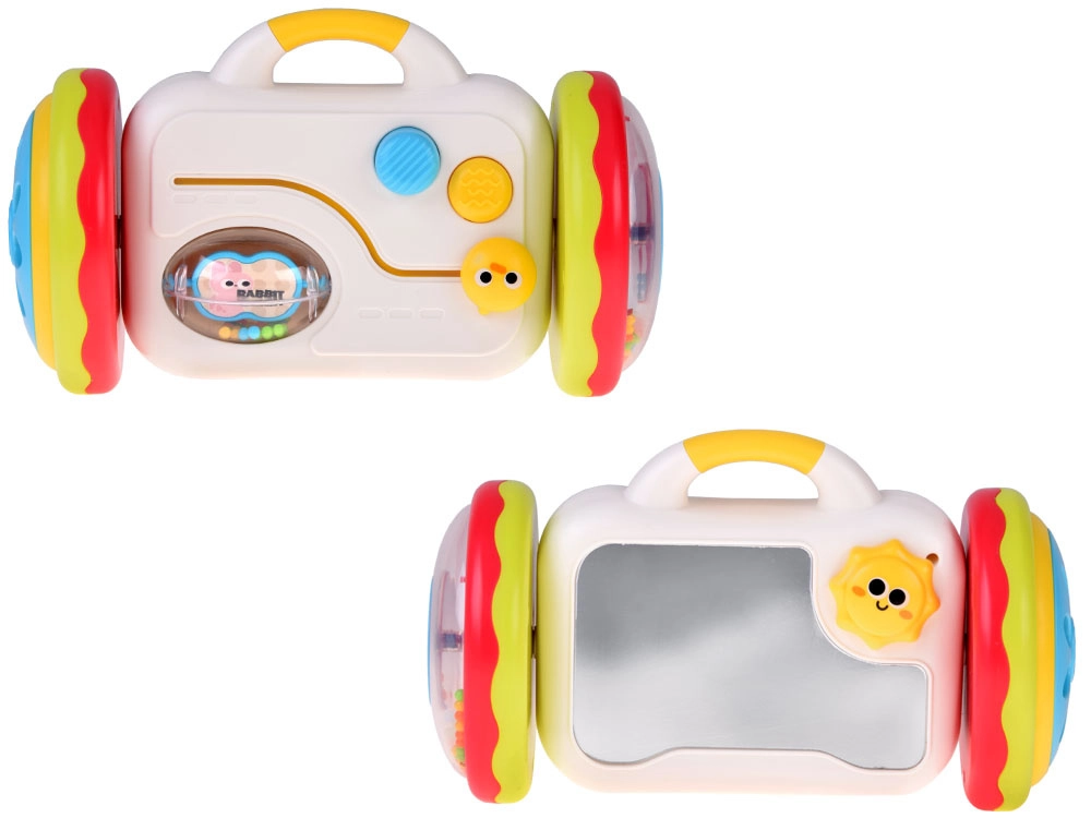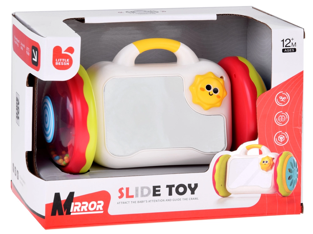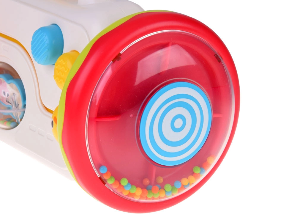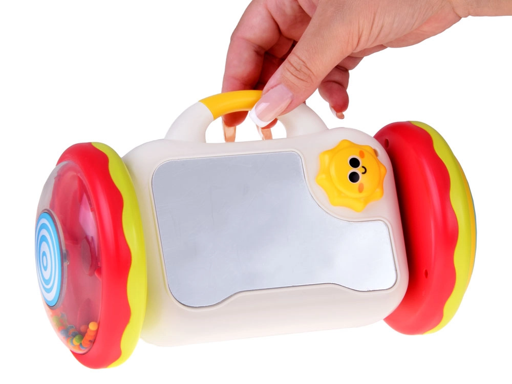 Interaktivna igrača na kolesih združuje zabavo in učenje v enem. Otroka pritegnejo žive barve, različne teksture, gumbi in drsniki, prozorno okence s kroglicami ter ogledalo za varno samospoznavanje. Ročaj olajša prenašanje, zato je igrača odličen spremljevalec doma in na poti.