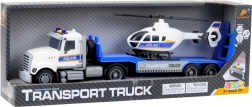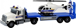Ta policijski transportni kamion ustvari popolno mobilno bazo za patruljiranje, posredovanja in reševalne akcije. Velik vlačilec s prikolico varno prepelje kompaktni helikopter, ki zaradi vrtečih se rotorjev v otroških scenarijih zlahka “vzleti” in “pristane”.