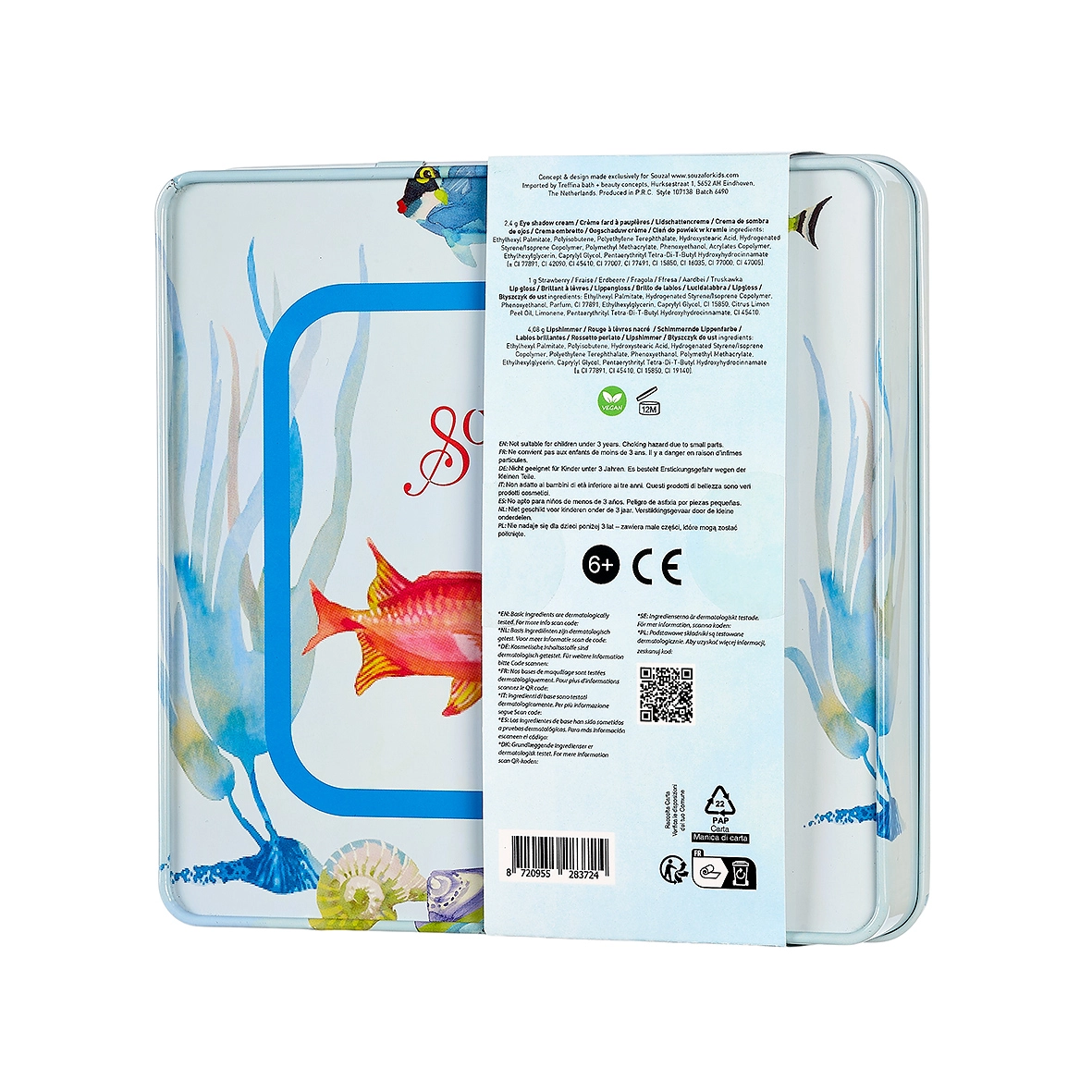 Elegantni otroški komplet ličil v kovinskem etuiju z motivom morske vile bo razveselil male navdušenke nad ličenjem od 6. leta dalje. Vsebuje bleščeča senčila za oči (rožnato, zlato, modro), 6 kremnih šmink v rožnatih odtenkih in tekoči glos za ustnice z okusom jagode. Priložen je dvojni aplikator. Kozmetika je dermatološko testirana, preprosto odstranljiva, 100 % veganska in ni testirana na živalih.