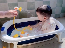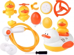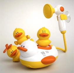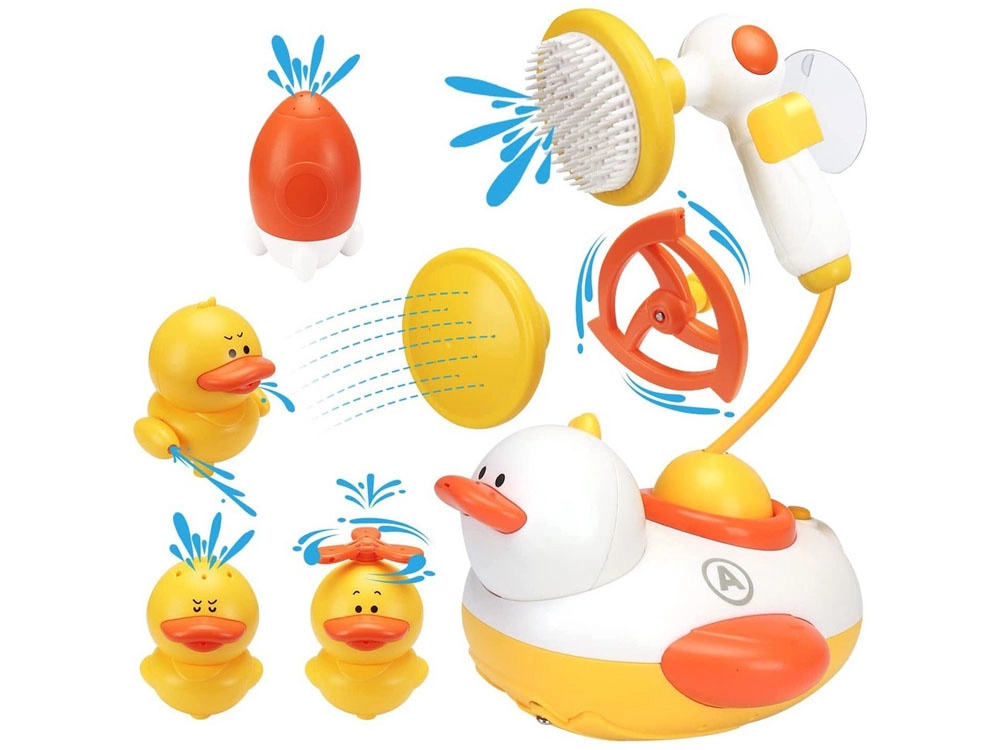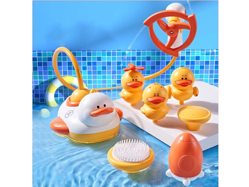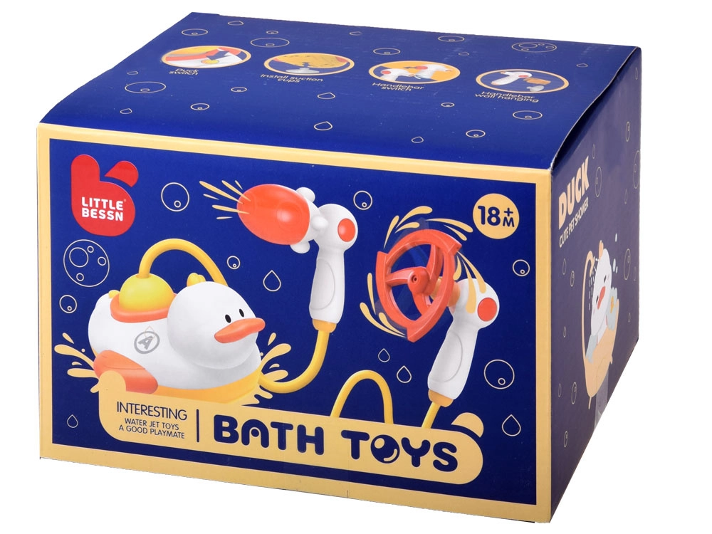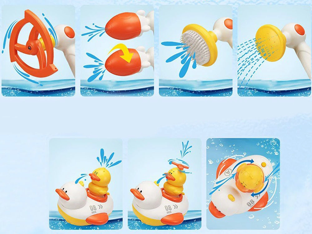 Plavajoča račka deluje kot vodna črpalka – ko jo položite na gladino in pritisnete gumb, začne črpati vodo ter skupaj z zamenljivimi dodatki ustvarja fontanice, razprševanje in vrteče učinke. Otroci lahko izberejo eno od treh malih račk z različnimi vodnimi atrakcijami ali uporabijo ročno prho z nastavki za nežno izpiranje.
