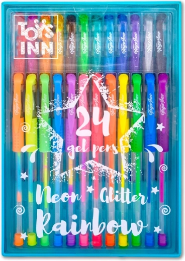 Odkrijte ustvarjalni set 24 gelnih pisal TOYS INN, ki združuje odtenke neonskih, bleščečih (glitter) in mavričnih (rainbow) barv. Zaradi tekočega pisanja in večbarvnega črnila so idealna za pisanje, označevanje, okraševanje in ustvarjanje. Praktično plastično ohišje olajša shranjevanje in prenašanje.