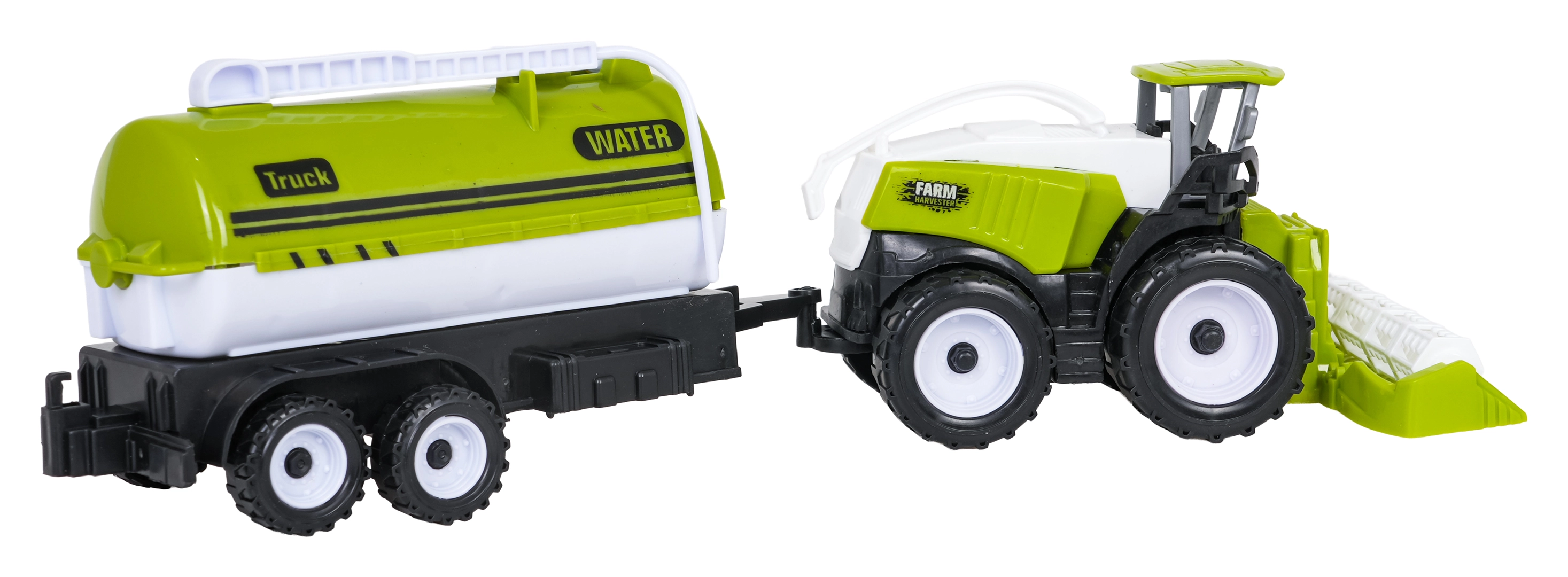Traktor s plugom, kombajn, prikolica in cisterna. Vse je mogoče medsebojno povezovati za še več igralnih scenarijev.