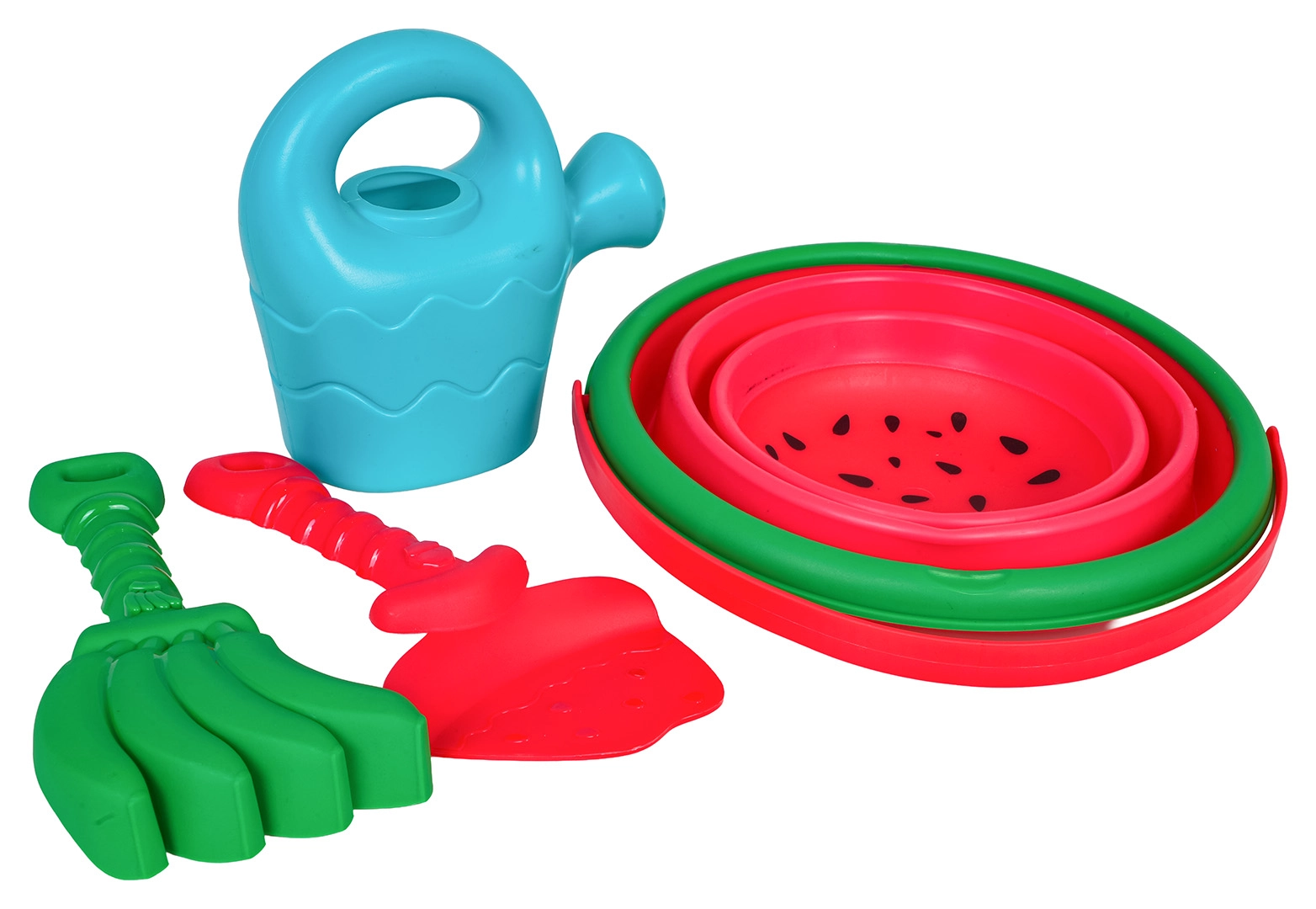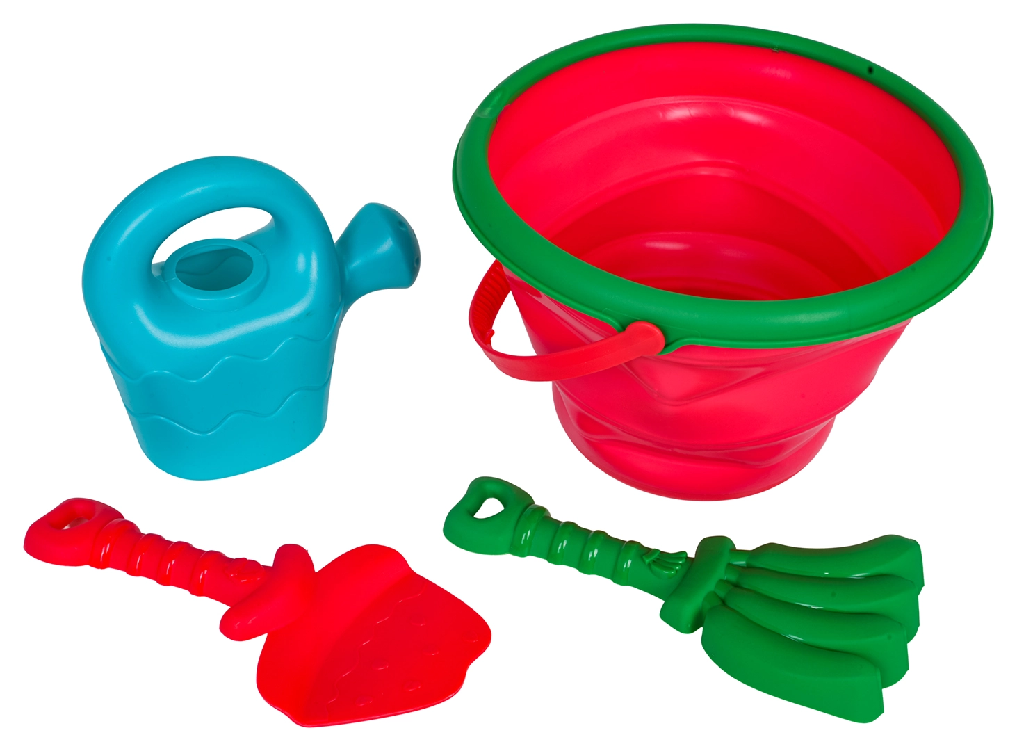 Lopatka, grabljice in kannica omogočajo otrokom kopanje, grabljenje, oblikovanje in prelivanje vode – vse v enem setu.