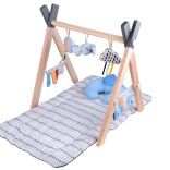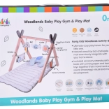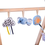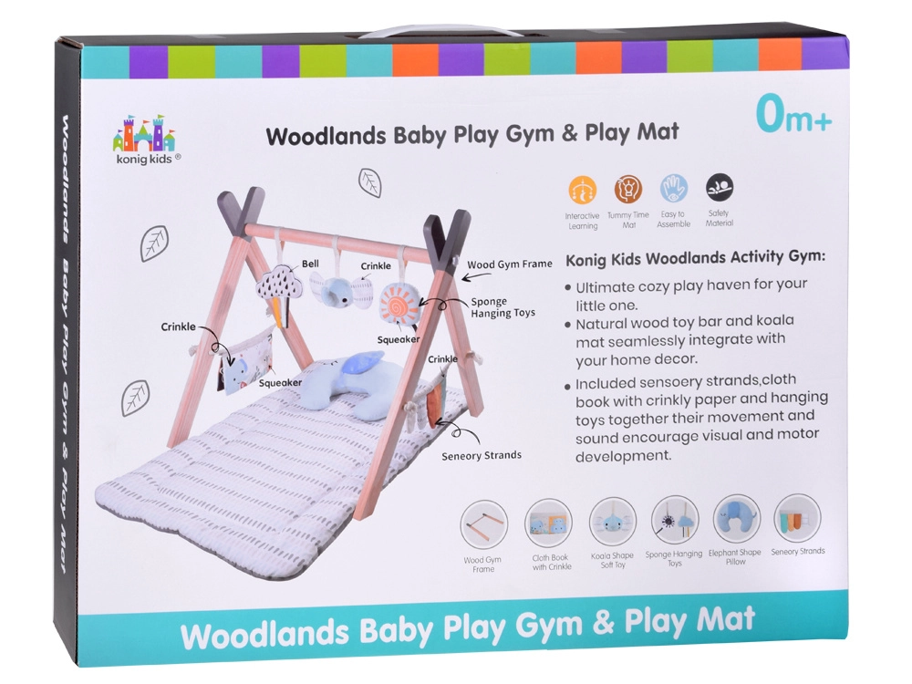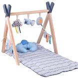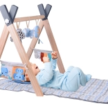 Stilska lesena baby gym dojenčku nudi udoben prostor na trebuščku in na hrbtu, medtem ko mehke viseče igrače vabijo k stezanju, prijemanju in raziskovanju različnih tekstur. Kontrastni elementi, šumeči materiali in piskalke naravno spodbujajo vid, sluh in dotik.
