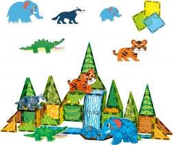 Magnetne ploščice različnih oblik in barv se zahvaljujoč vgrajenim magnetom preprosto in čvrsto spajajo. Otroci lahko ustvarjajo pisane konstrukcije s prvkami narave, kot so gibljiv slap, loki, grmi in drevesa, ter prizor oživijo z živalskimi figuricami – slon, tiger, krokodil in volk.