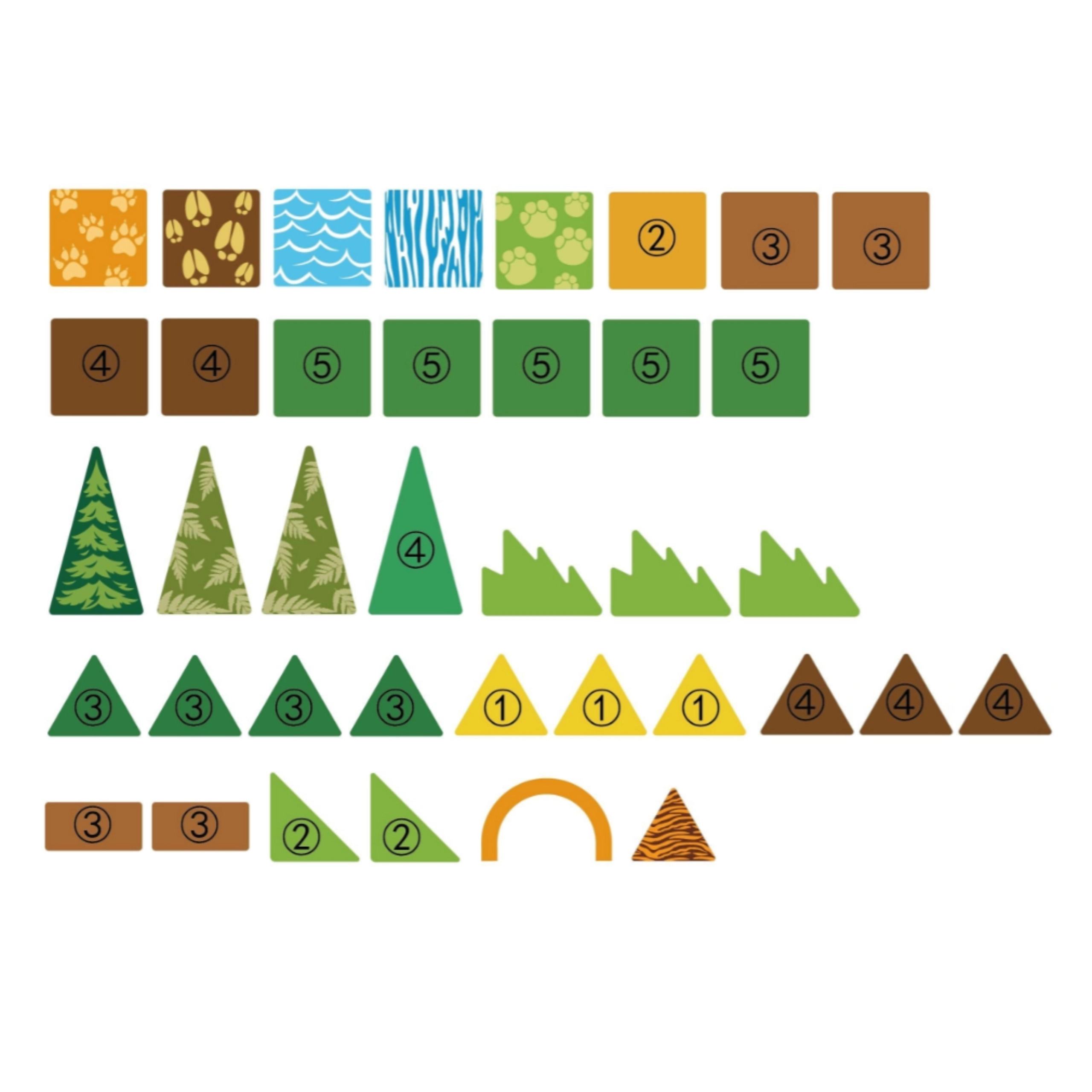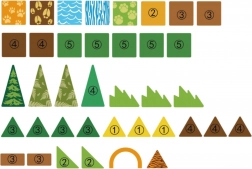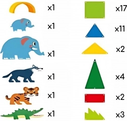 magnetne ploščice (različne oblike in barve), figurice živali (2× slon, tiger, krokodil, volk), gibljiv slap, lok, grmi in drevesa