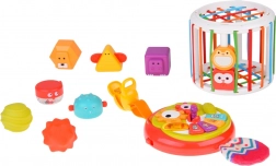 Sortirka je sestavljena iz elastičnih barvnih trakov, ki omogočajo enostavno vstavljanje in izvlek delčkov ter naravno razvijajo prijem, moč in natančnost prstov. Ne manjka majhno varno ogledalce za odkrivanje lastnega odseva in komplet 7 raznobarvnih elementov za vstavljanje. Celota spodbuja sluh, vid in tip, podpira koncentracijo in samostojno raziskovanje.
