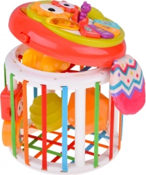 Interaktivna sova 2v1 ponuja dve igri v eni: elektronski del z gumbi živalic in toni ter samostojno barvno sortirko. Po vklopu predvaja pozdravno melodijo, posamezni gumbi aktivirajo imena tonov, zvoke živali, kratke instrumentalne melodije in vesele pesmice. Otroci uživajo v vrtečih se očeh, gibljivih krilcih s kroglicami, mehkem šumečem repku in vlečnem »črvičku« na elastiki.