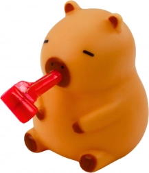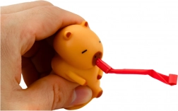 Rjava kapibara z rdečo trobento je izdelana iz prijetno mehkega in elastičnega materiala, ki je odličen za stiskanje in spodbuja sprostitev. Ob stisku se aktivira piskajoči zvok in iz gobčka se izvleče trobenta, kar iz igrače naredi odličen antistresni pripomoček in izvirno zabavo za skupine.