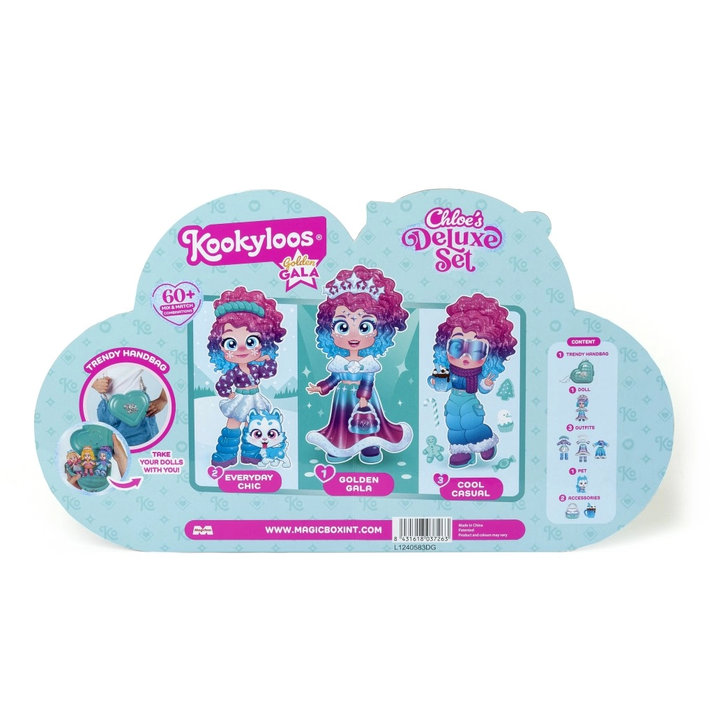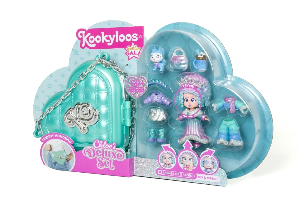 Odkrij slog in zabavo s punčko KookyLoos Chloe v razkošnem setu Golden Gala Deluxe. Čakajo te 3 mix & match outfiti, zamenljivi izrazi obraza na en klik, ljubek ljubljenček in elegantna torbica v obliki srca za na pot. Popolno za kreativno preoblačenje, igro in zbiranje.