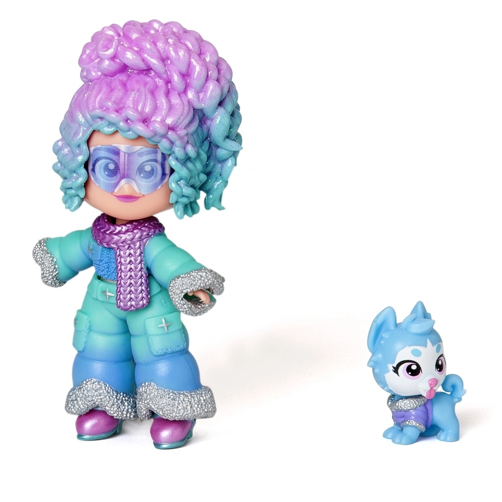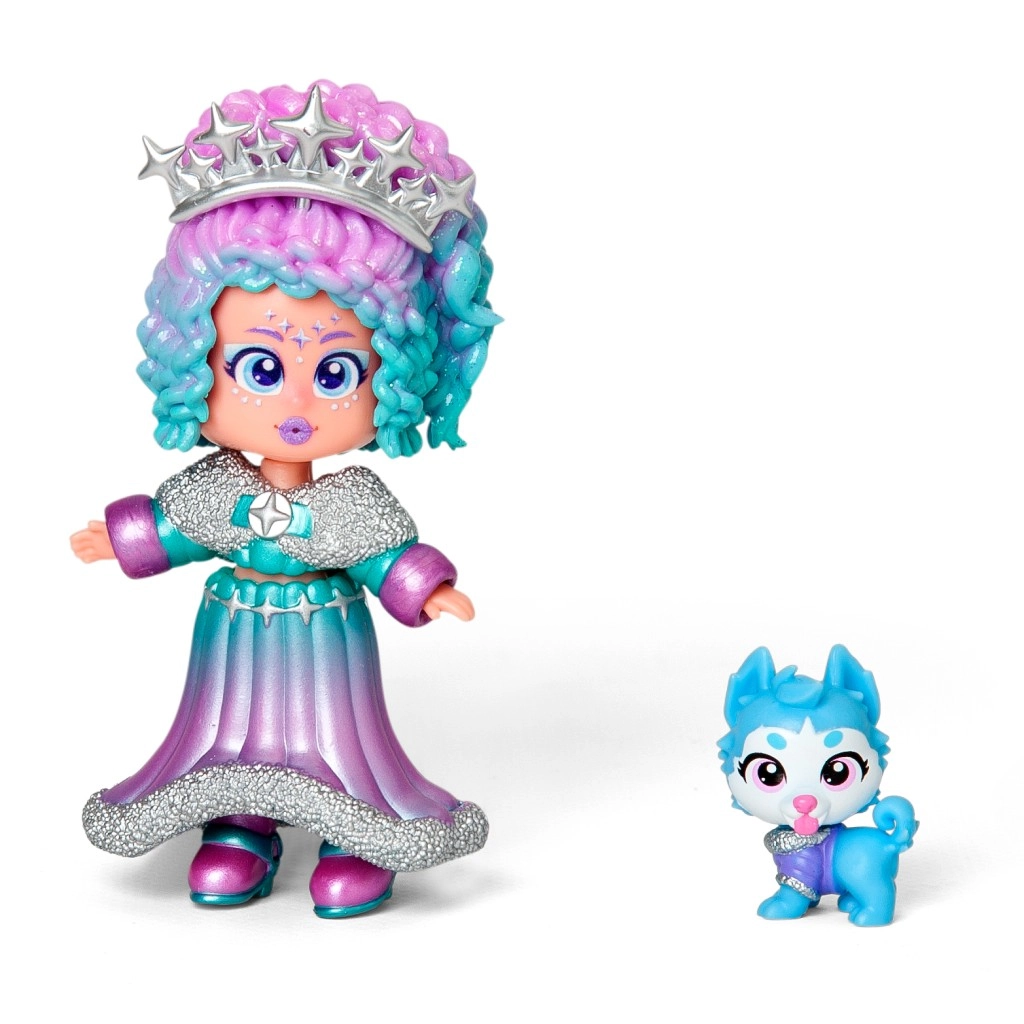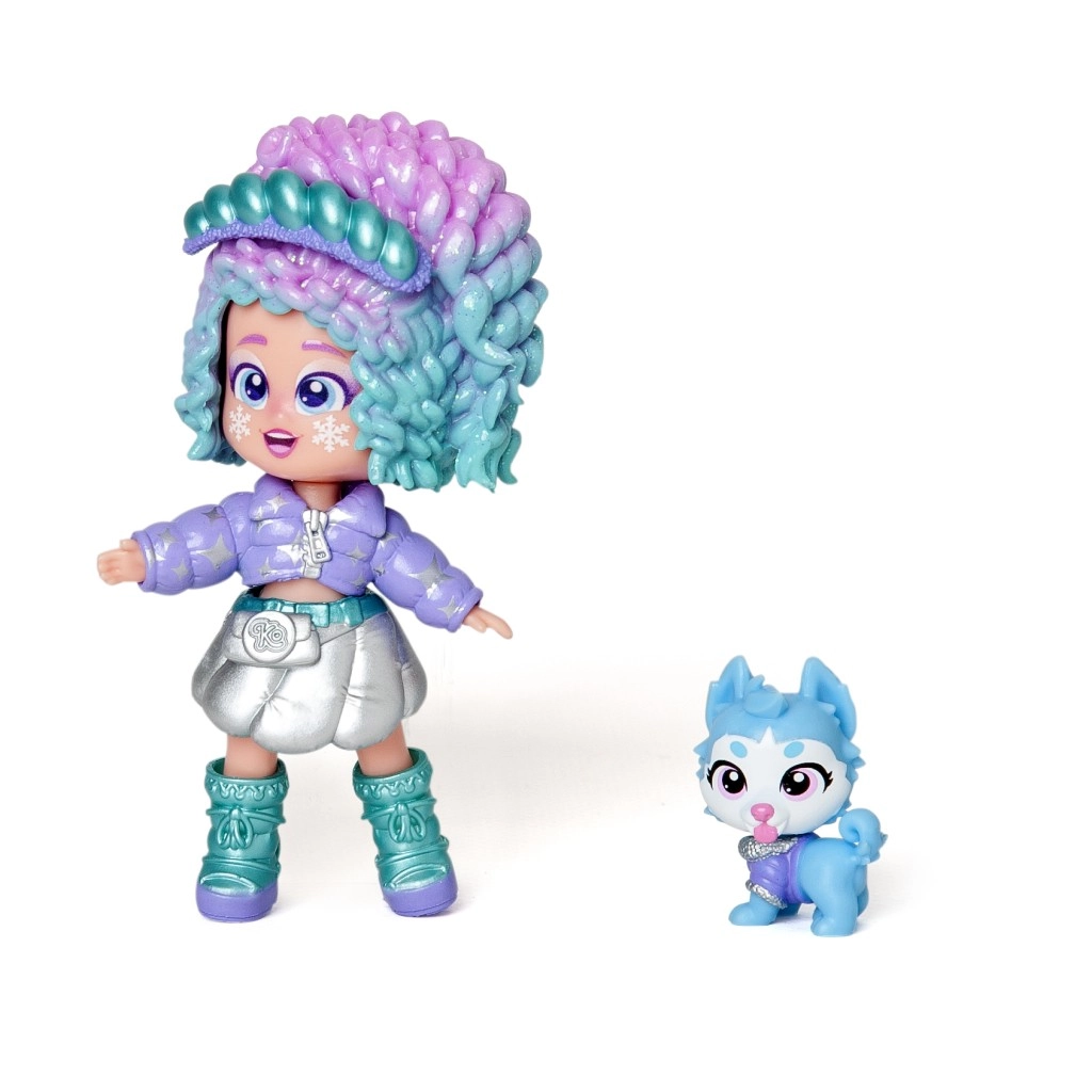 Stilska punčka z izrazitimi lasmi in bleščečimi poudarki je dopolnjena z ljubkim kužkom za še več domišljijskih zgodb.