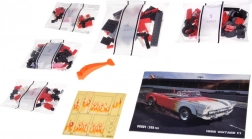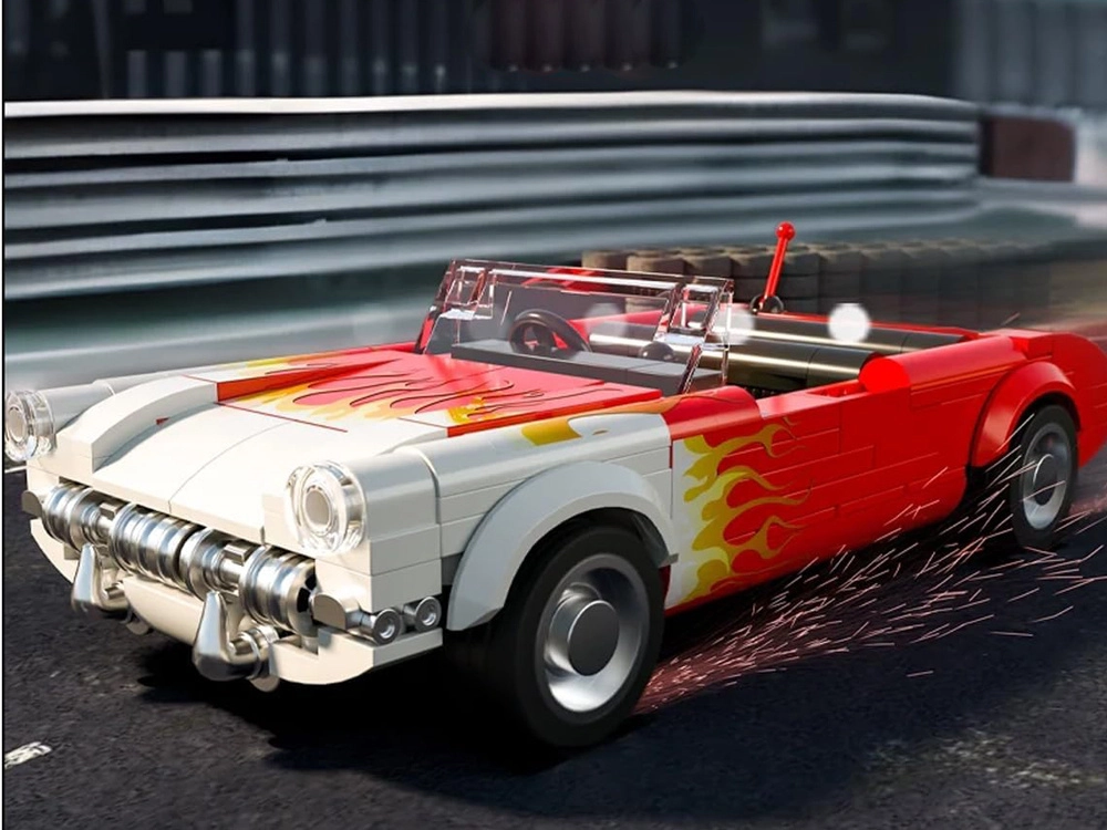 Rdeče-beli roadster s plameni, odprtim kokpitom in podrobno masko prinaša vzdušje klasičnih ameriških vozil iz 50. let.
