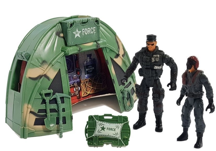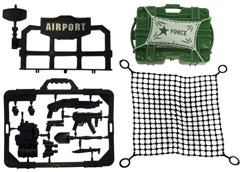 - Helikopter SWAT z zvoki, vojaški motorni čoln, 3 figurice vojakov, pristajalna ploščad, šotor/ukazni center, komplet orožja, velika mreža
