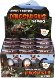 Potopite jajček v skodelico z vodo in opazujte, kako se v 24–48 urah začne lupina postopoma odpirati. Približno v 72 urah se iz jajčka izvali majhen dinozaver – bo to T‑Rex, stegozaver, brontozaver ali povsem druga vrsta? Vsak jajček skriva presenečenje, zato je idealno darilo za otroke.