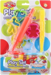 - 2 lončka plastelina, valjar, škarjice, 4 modelčki