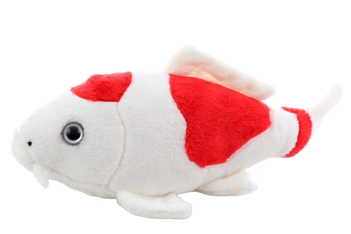 Ta mehak plišasti koi krap v belo-rdeči barvni kombinaciji bo razveselil vsakega otroka in ljubitelje živalic. Je prijetno mehak, lahek in lepo sede v roko, zato je popoln za crkljanje, igro in umirjanje pred spanjem.