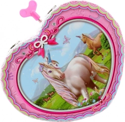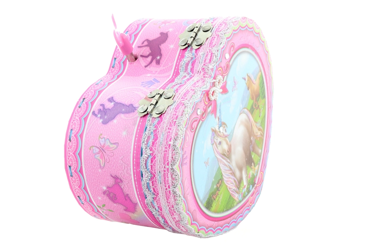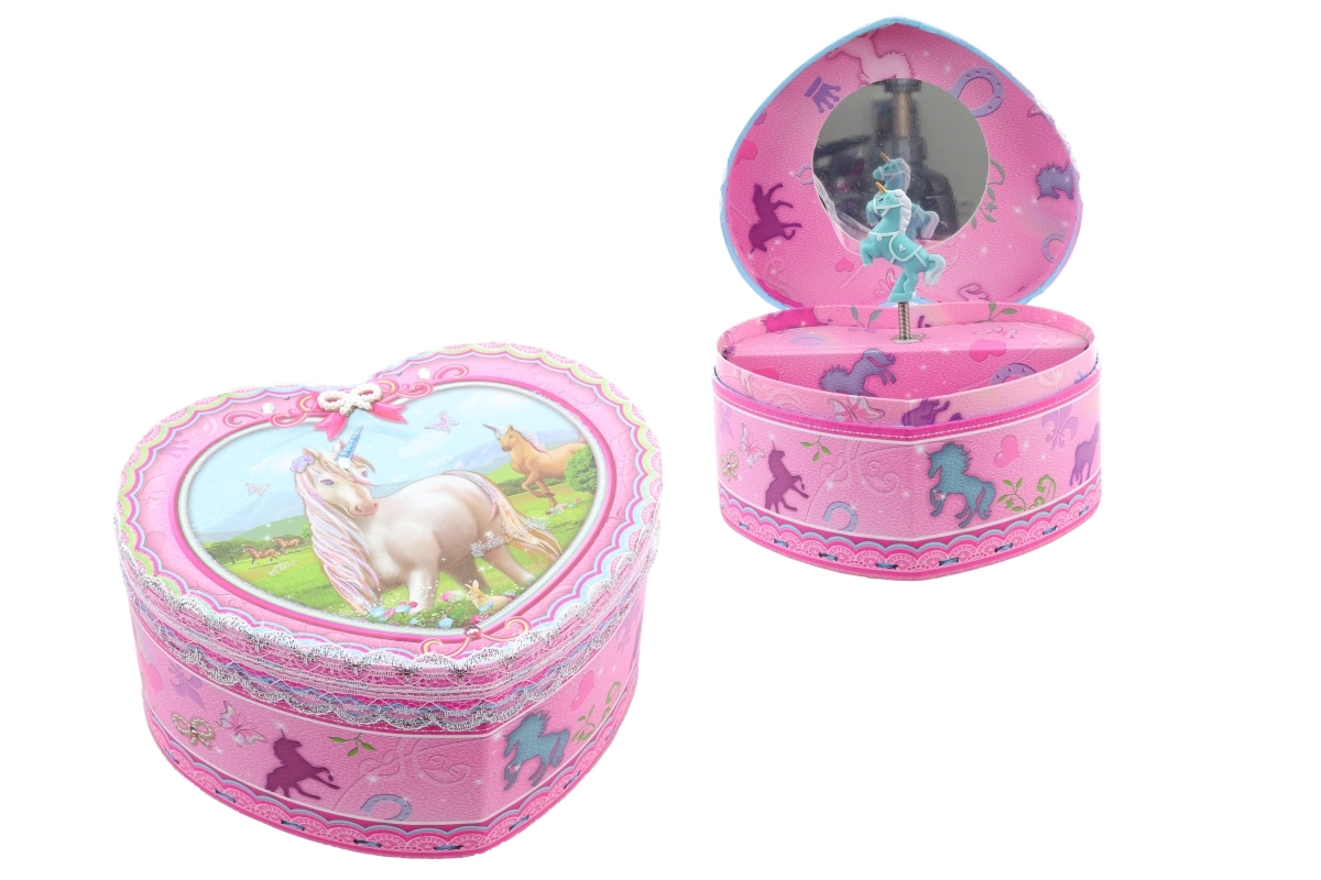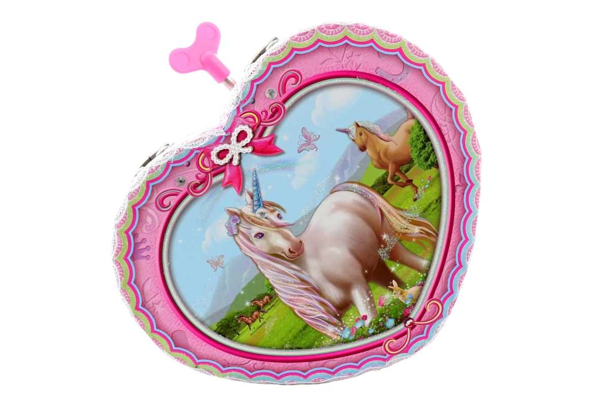 Čarobna rožnata škatlica za nakit v obliki srca z motivom samoroga bo razveselila male in velike ljubiteljice prikupnih dodatkov. Po navijanju ključka se v notranjosti pred ogledalcem zavrti balerina in zazveni nežna melodija. Idealna za shranjevanje drobnega nakita in zakladkov, z dekorativno izvedbo, ki polepša vsak prostor. Glasbeni mehanizem, ogledalce, vrteča se balerina, samorog motiv in kompaktne mere.