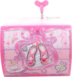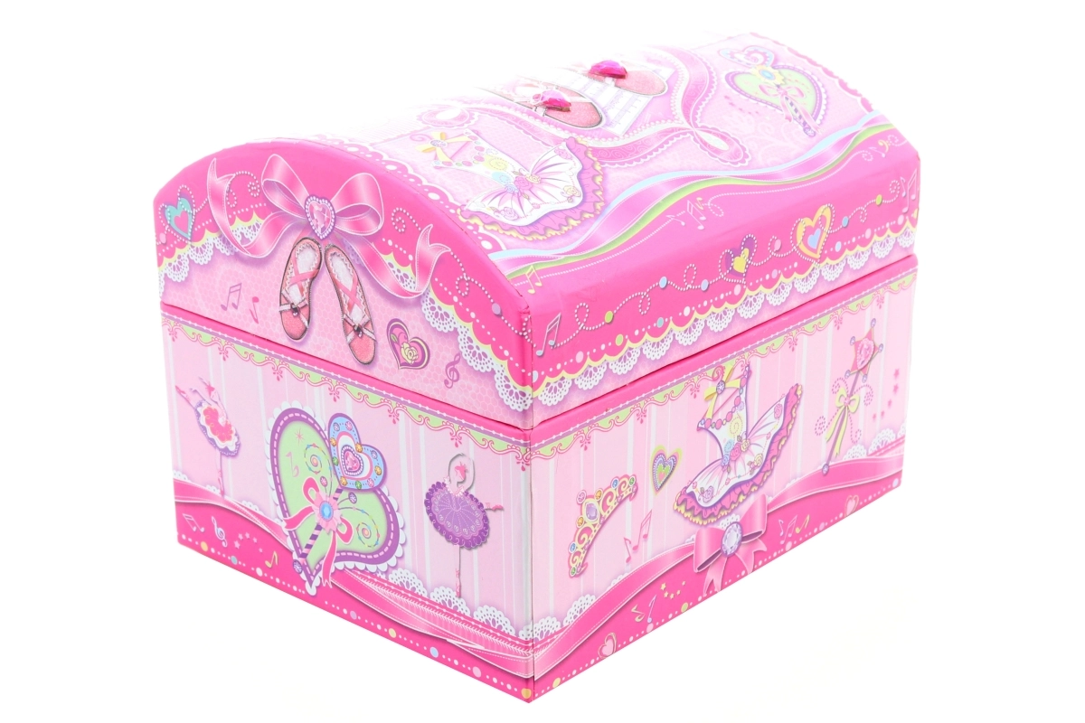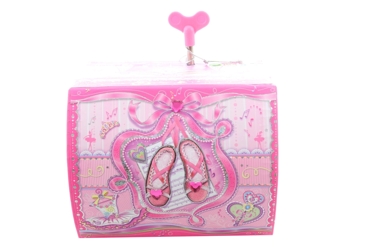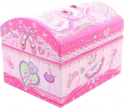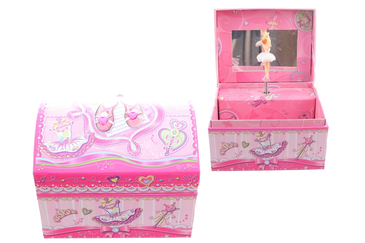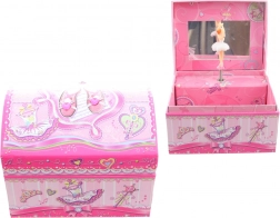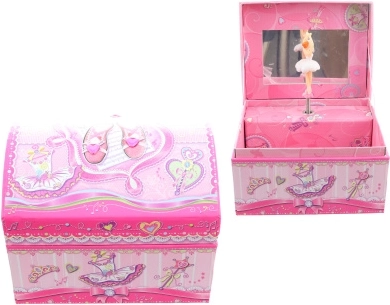 Ta prikupna škatlica za nakit v obliki skrinjice je idealen prostor za shranjevanje prstanov, uhanov in drugih drobnarij. Po navijanju ključka in odprtju pokrova se pred ogledalcem zavrti figurica balerine, zazveni melodija in ustvari se čarobno vzdušje.