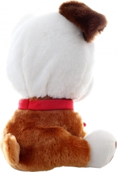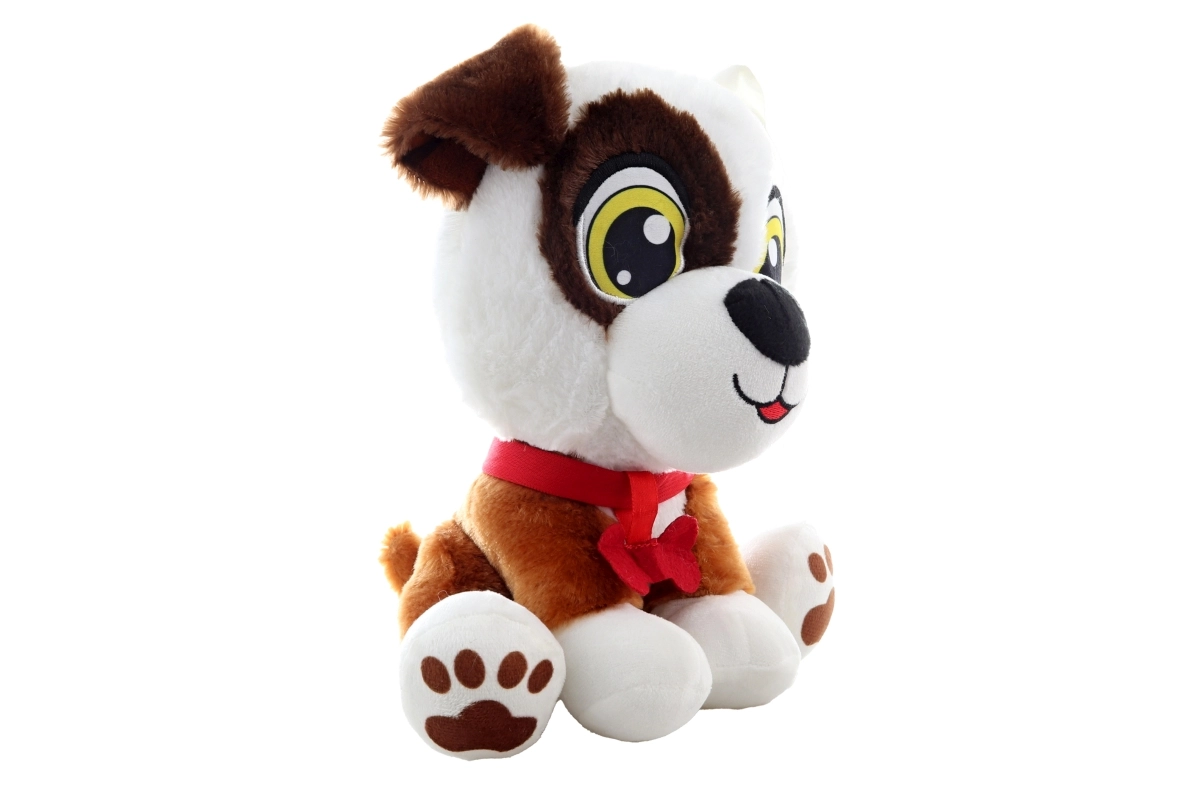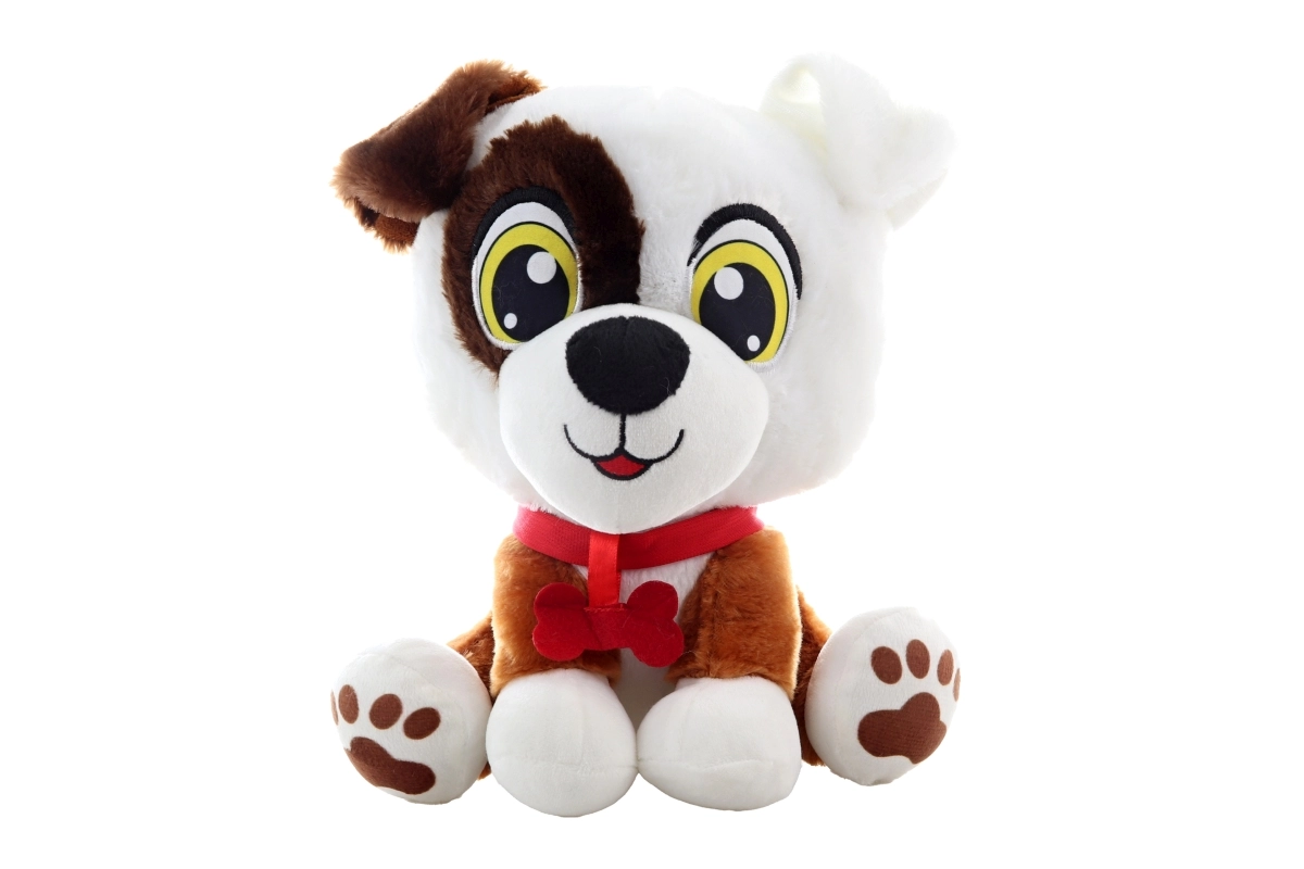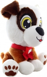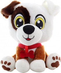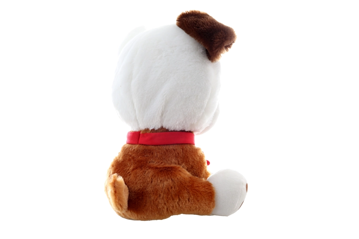 Ta mehak plišasti kužek v kombinaciji bele in rjave barve je ustvarjen za objeme. Ima izvezene obrazne detajle, tačke s potiskom ter rdeč ovratnik s pentljo in kostjo, zato deluje prijazno in igrivo. Je varen za najmlajše otroke in se odlično poda v posteljico ali otroško sobico kot dekoracija.