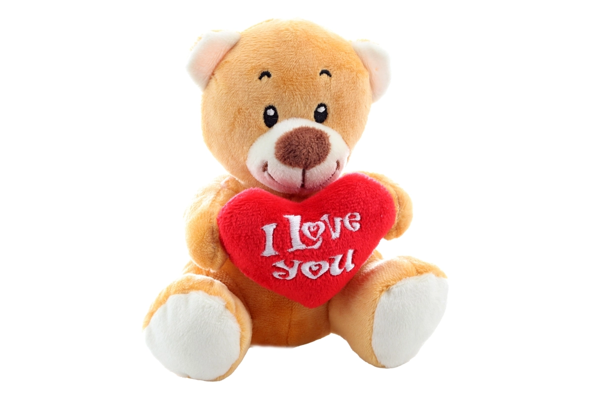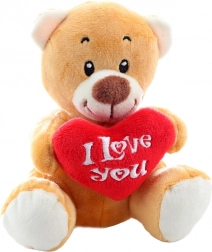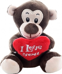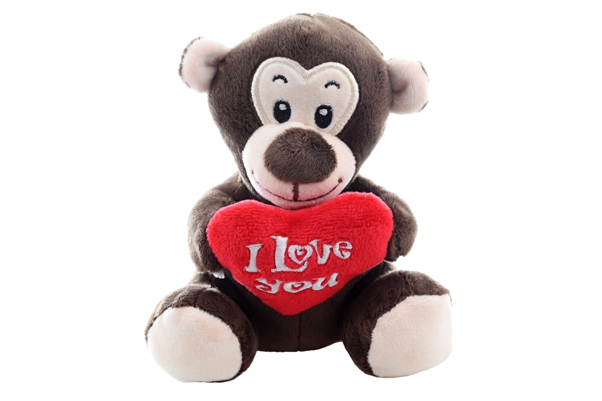 Vpadljiv rdeč srček z vezenim napisom doda igrački čar in jo spremeni v popolno darilo iz ljubezni.