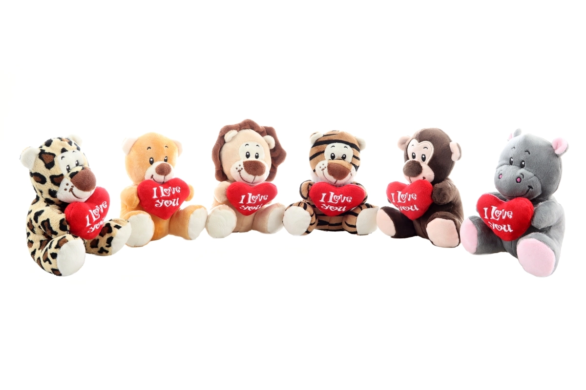 Prisrčna plišasta živalca z rdečim srčkom »I Love You« razveseli otroke in odrasle. Izbirate lahko med več vrstami – tiger, lev, leopard, medvedek, opička in povodni konj. Igrača je mehka, žametna na dotik in idealna kot darilo iz ljubezni, objemček za spanje ter okras v otroški sobi. Primerno od 0+.