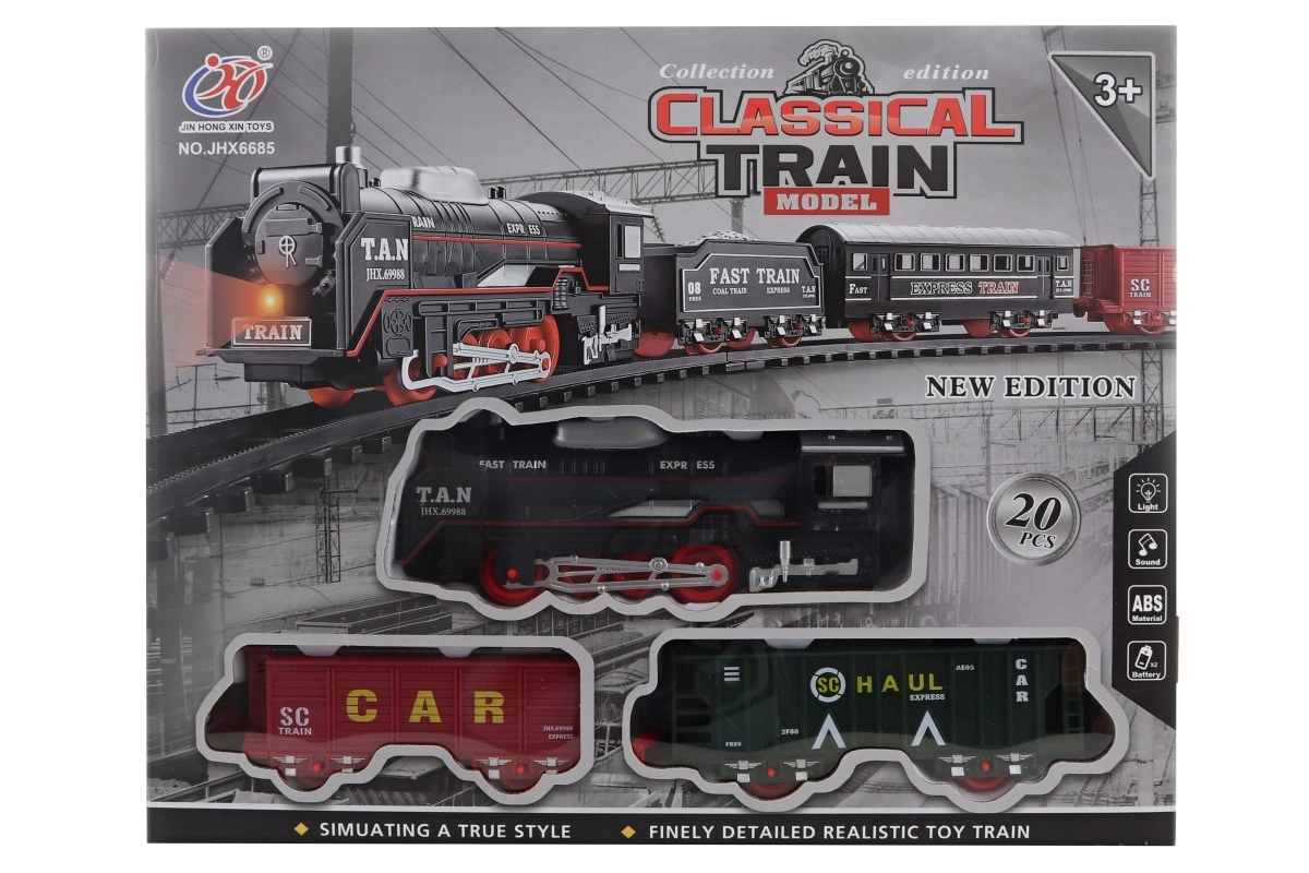 • Kompleten set – lokomotiva, 2 vagona, 8 krožnih in 2 ravna tira + nalepke.