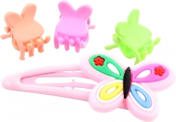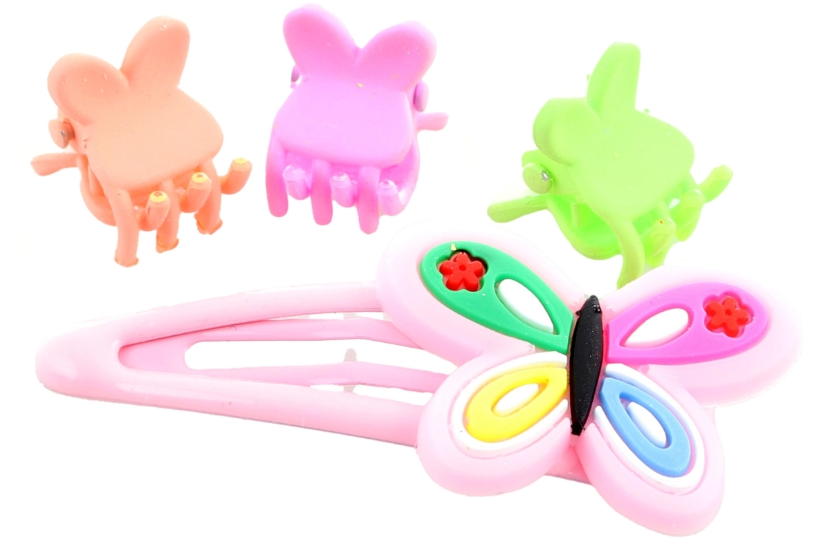 Ustvarite v nekaj trenutkih učinkovit in udoben videz. Ta komplet dodatkov za lase združuje okrasno sponko z motivom metuljčkov in tri praktične ščipalke, ki držijo pramene na mestu brez vlečenja in lomljenja las. Zaradi kompaktnih mer so dodatki primerni za torbico in potovanja.