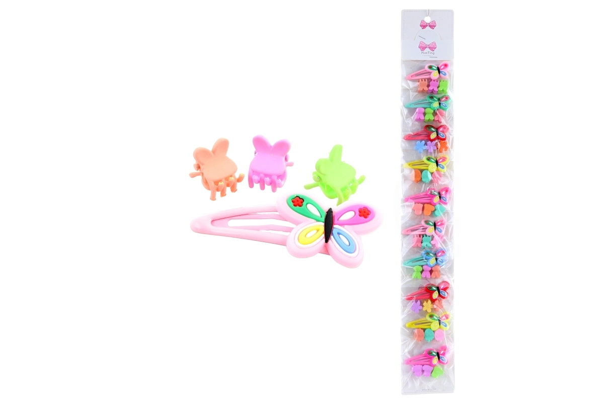 Praktičen komplet za vsakodnevno urejanje las in manj zahtevne slavnostne pričeske. Vsako pakiranje vsebuje 1 sponko z motivom metuljčkov in 3 mini ščipalke, vse kompaktno zapakirano v vrečki. Idealno za hitro spenjanje pramenov, dekorativni styling in nežne otroške ter damske pričeske. Dobavljamo samo po pakiranju 10 kosov (mešanica različnih vrst).