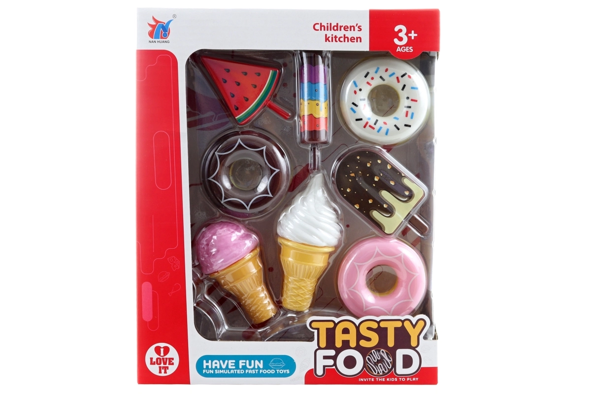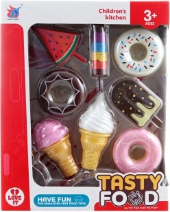 Zabaven set sladkih jedi za male kuharje bo razveselil vsakega otroka od 3. leta dalje. Vsebuje različne plastične dobrote za ustvarjalno igro kuhanja in trgovanja. Varen plast, lahka in trpežna izvedba ter kompaktna embalaža zagotavljajo enostavno shranjevanje in prenašanje.