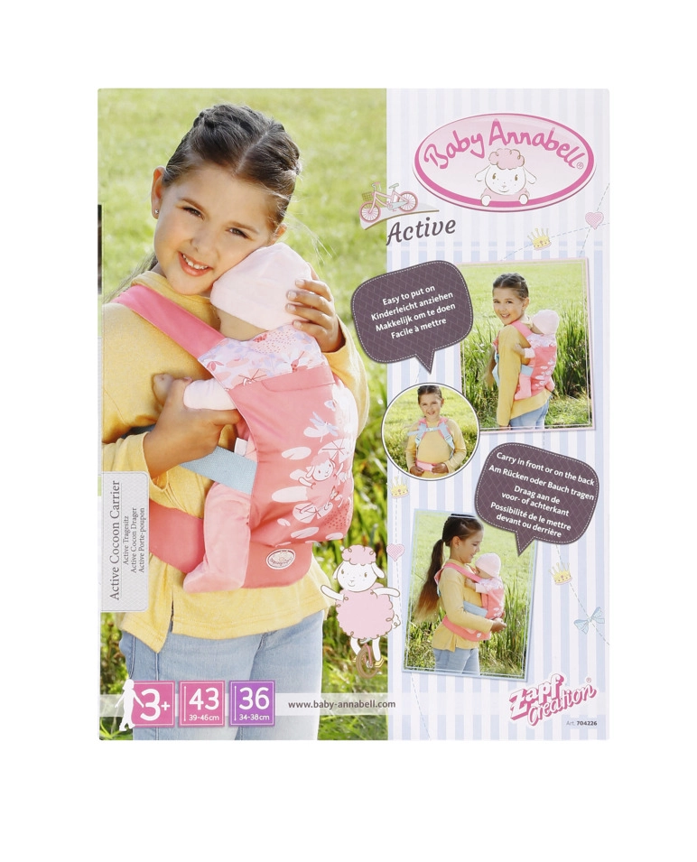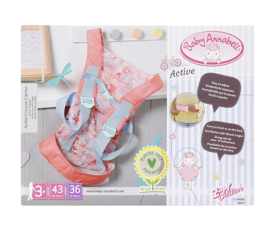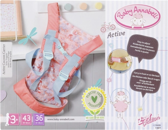 Praktična nosilka za punčke BABY ANNABELL je odlična za male skrbnike, ki želijo imeti svojo punčko vedno pri sebi. Z možnostjo nošenja spredaj in na hrbtu ter dvema sprednjima sedečima položajema (obrnjeno naprej ali proti otroku) bodo otroci uživali v udobni in varni igri na vsakem izletu.