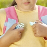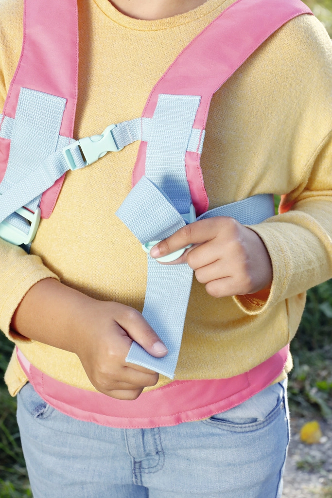 Oblazinjeni ramenski trakovi, prsna zaponka in ledveni pas se zlahka prilagodijo različnim višinám otrok in držijo punčko stabilno.